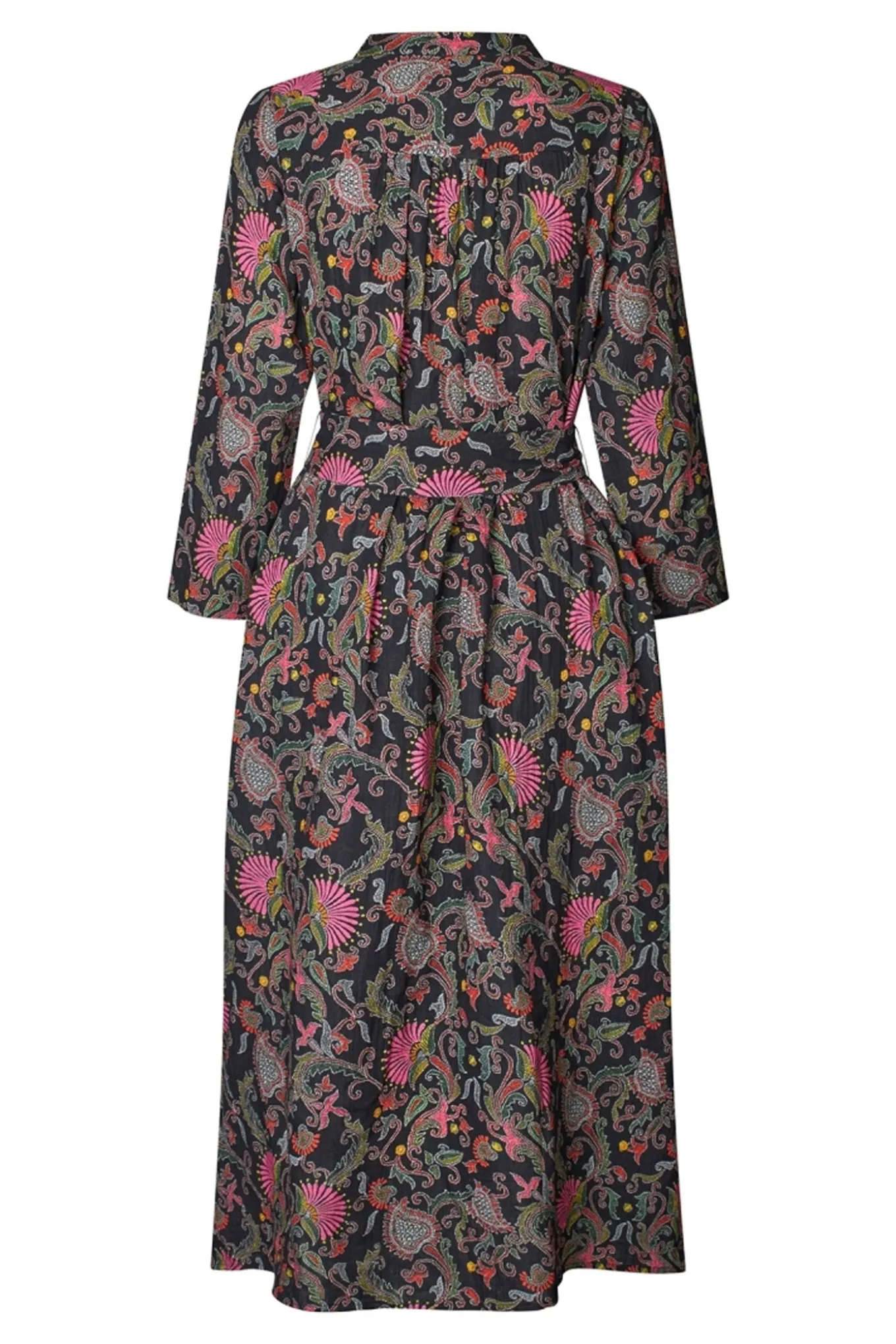 Smuk maxi kjole fra Lollys Laundry med ¾ lange ærmer, kinakrave i halsen og skjult knaplukning langs fronten. Kjolen har også den smukkeste kvalitet og kommer med et bredt bindebælte i taljen.