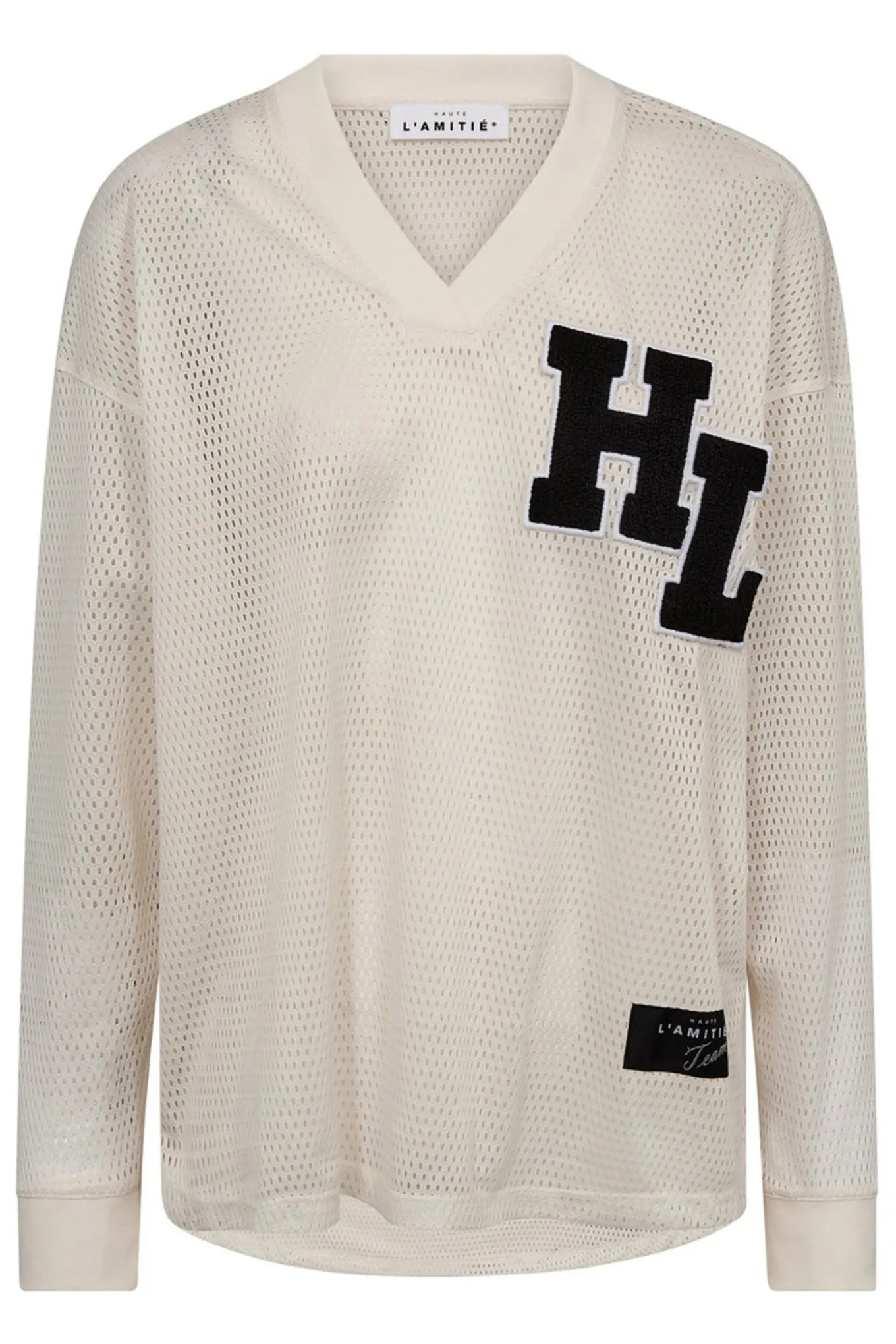 OBS! Fjernlager. Levering kan blive forlænget med 2-3 dage, hvis varen ikke findes i vores butik lige nu.Cool sporty bluse fra Haute L’Amitié med lange ærmer, v-udskæring i halsen og et stort logo på brystet.