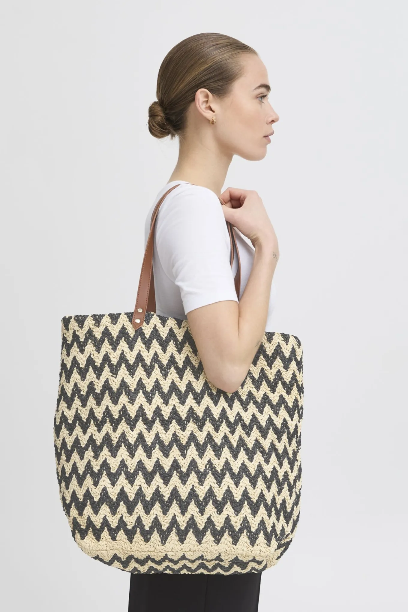 OBS! Fjernlager. Levering kan blive forlænget med 2-3 dage, hvis varen ikke findes i vores butik lige nu.Super smart taske fra Ichi Accessories med et skønt flettet mønster og en fin bærehank i toppen.