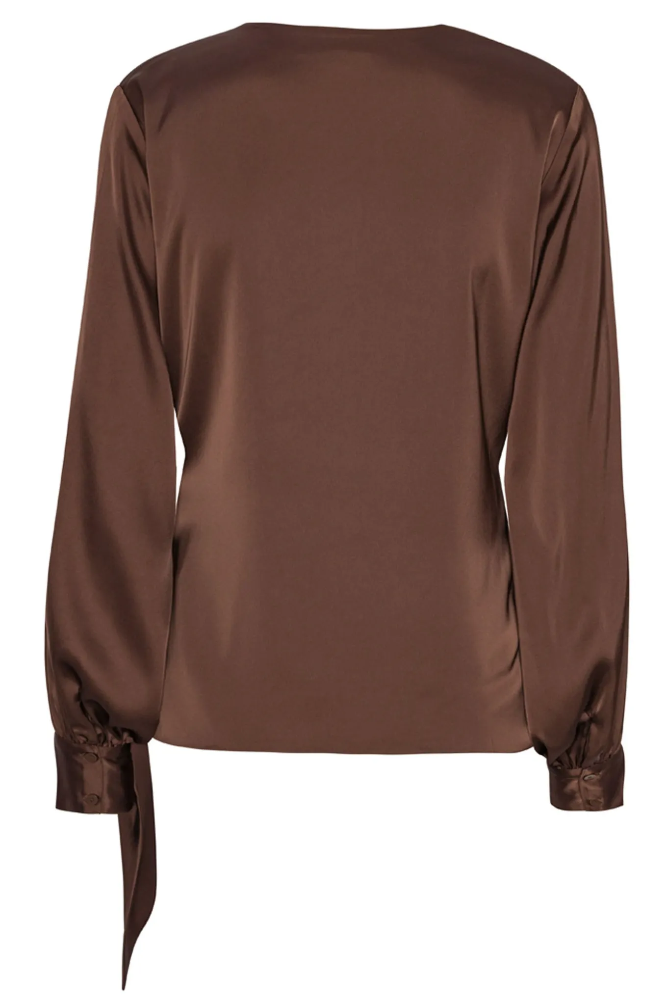 Elegant bluse fra Karmamia med lange ærmer og v-hals. Blusen har et smukt draperet og asymmetrisk snit samt let puffede ærmer med brede manchetter.