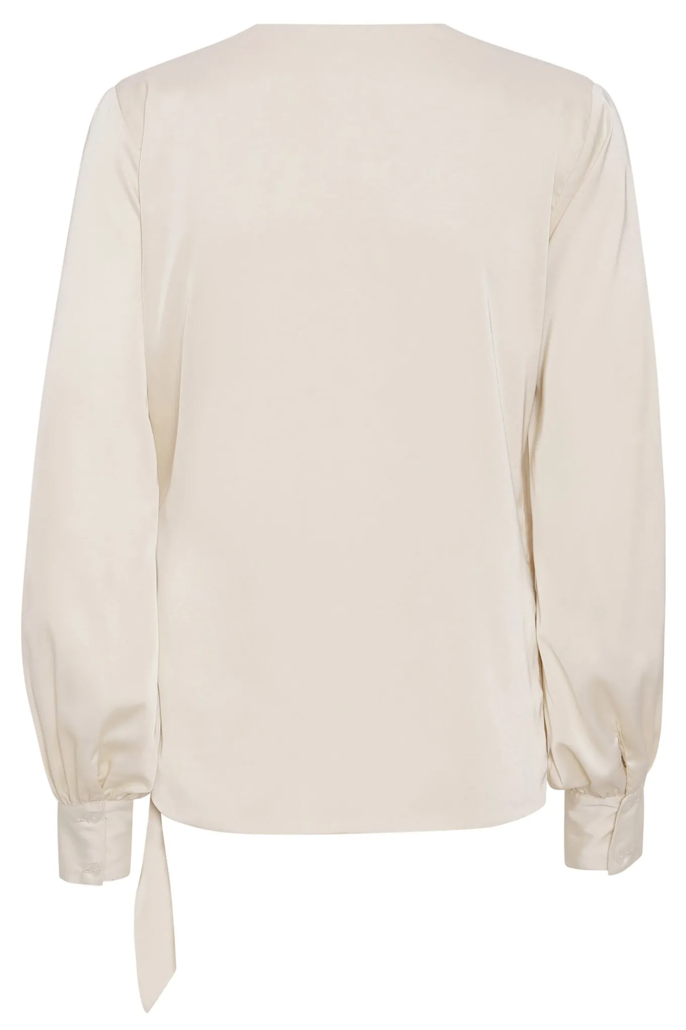 Elegant bluse fra Karmamia med lange ærmer og v-hals. Blusen har et smukt draperet og asymmetrisk snit samt let puffede ærmer med brede manchetter.
