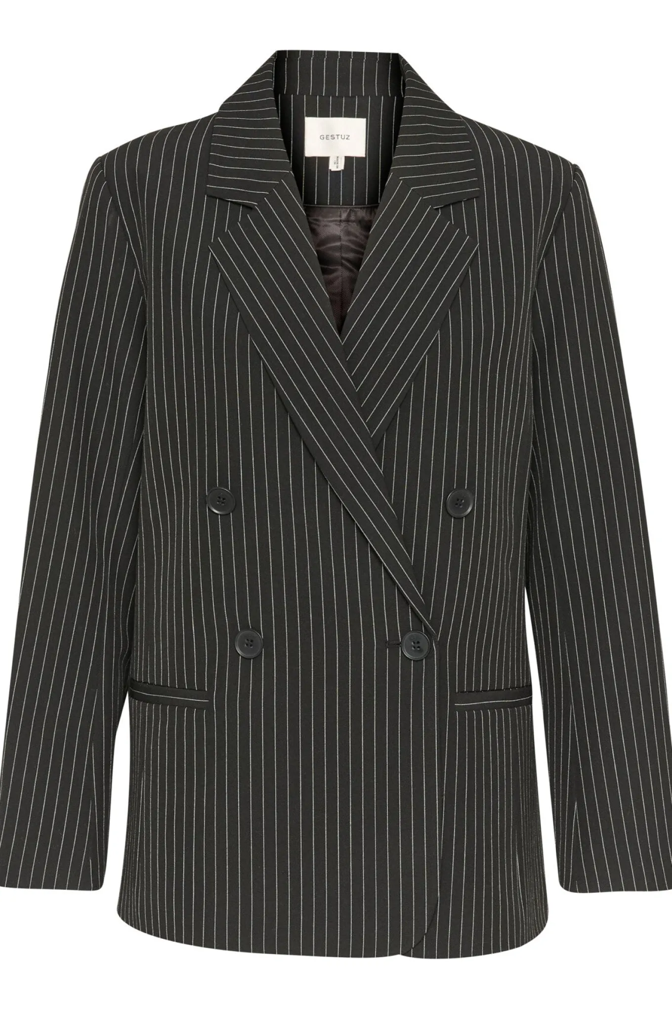 OBS! Fjernlager. Levering kan blive forlænget med 2-3 dage, hvis varen ikke findes i vores butik lige nu.Smart pinstripe blazer fra Gestuz med lange ærmer, v-udskæring med en bred krave i halsen og en boxy pasform.