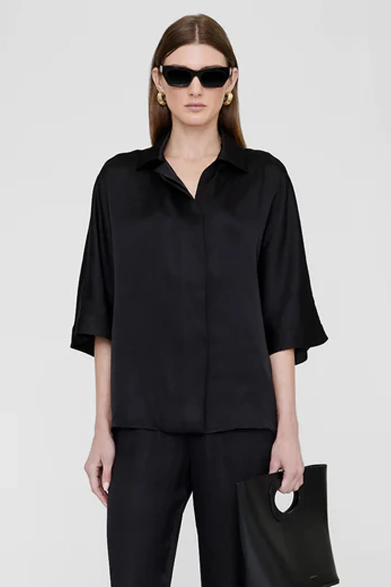 Elegant skjortebluse fra Anine Bing med ½ lange ærmer, skjortekrave i halsen og skjult knaplukning langs fronten.
