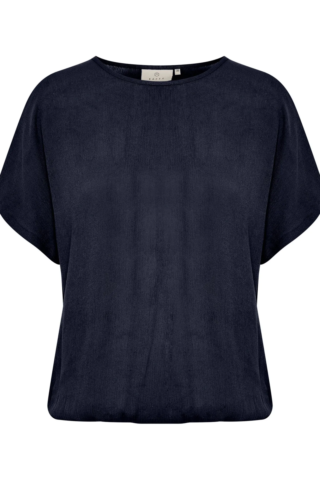 OBS! Fjernlager. Levering kan blive forlænget med 2-3 dage, hvis varen ikke findes i vores butik lige nu.Smart t-shirt fra Kaffe med korte ærmer, rund hals og en løstsiddende pasform.Blusen har også en smal elastikkant i bunden der giver den en fin silhuet.