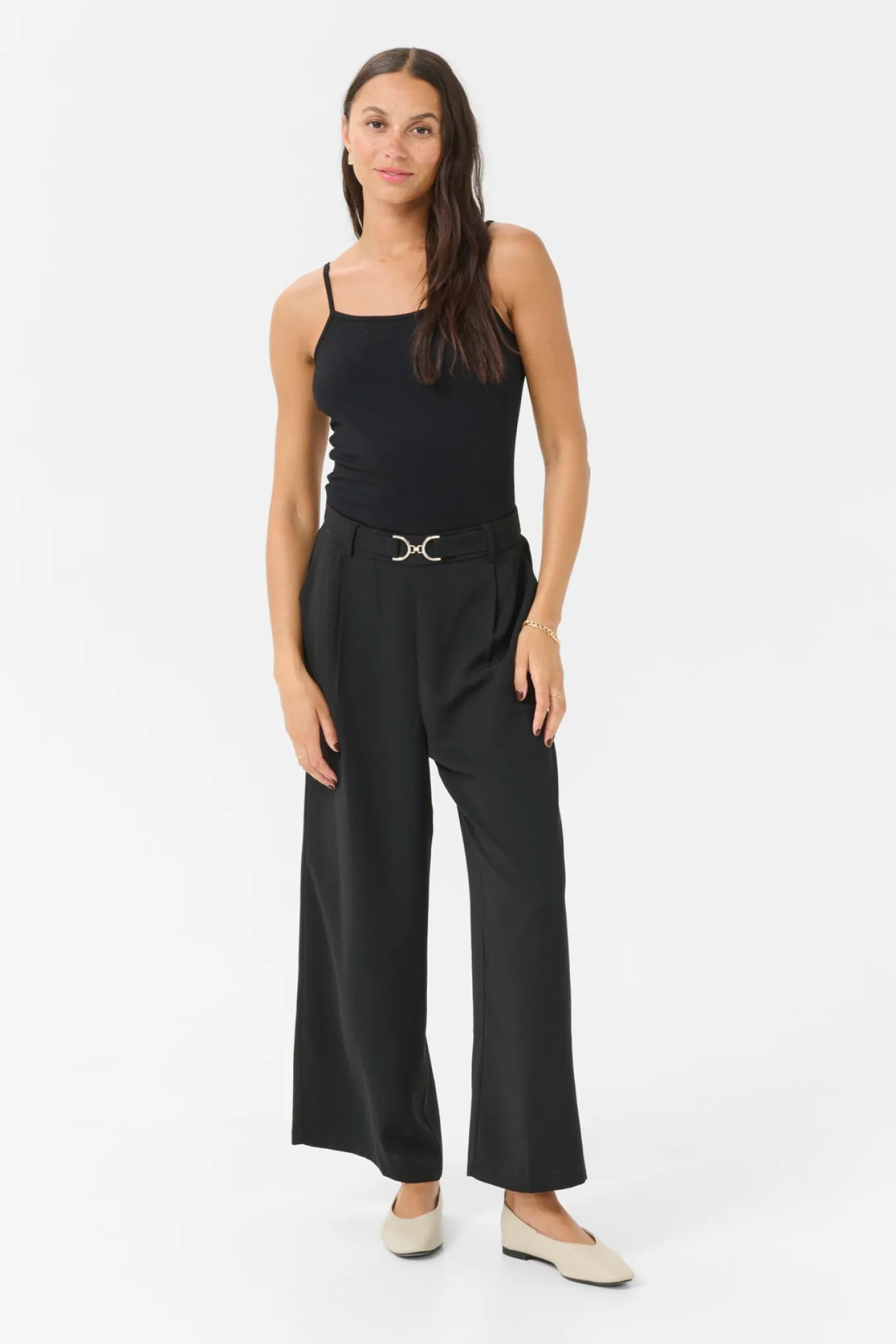 OBS! Fjernlager. Levering kan blive forlænget med 1-2 dage, hvis varen ikke findes i vores butik lige nu.Smarte bukser fra Kaffe med en bred kant i taljen, vidde i benene og en cropped længde.Bukserne har også et flot bælte i taljen og en super lækker kvalitet.