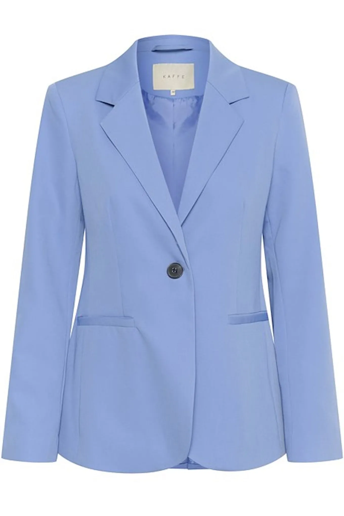 OBS! Fjernlager. Levering kan blive forlænget med 2-3 dage, hvis varen ikke findes i vores butik lige nu.Flot blazer fra Kaffe med lange ærmer, en klassisk krave om halsen og en stor knap til at lukke med i fronten.