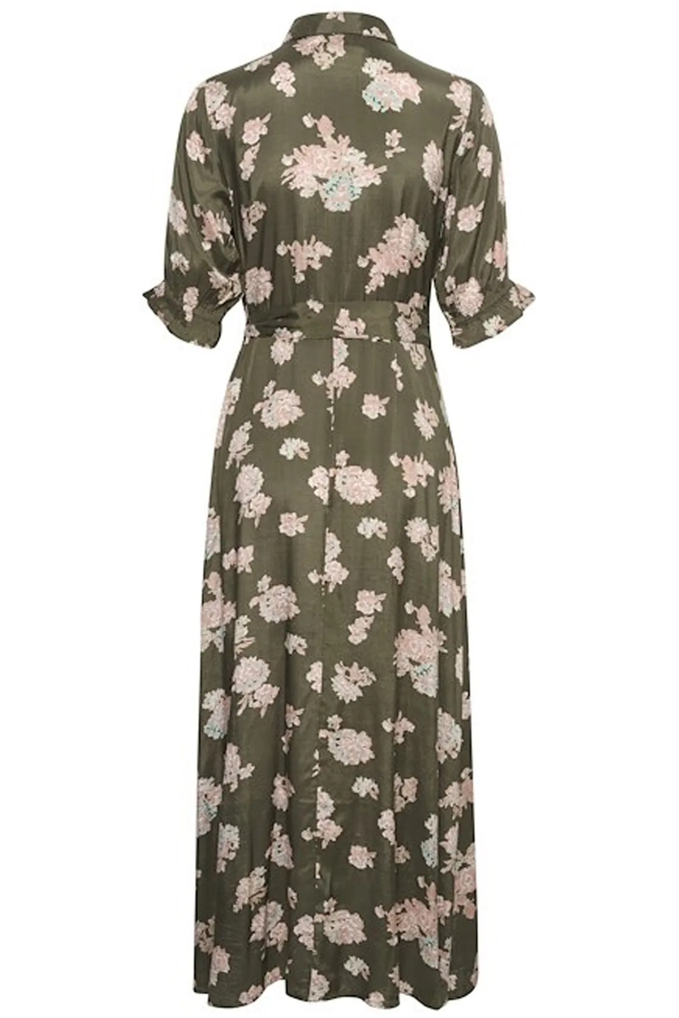 OBS! Fjernlager. Levering kan blive forlænget med 2-3 dage, hvis varen ikke findes i vores butik lige nu.Skøn kjole fra Kaffe med ½ lange pufærmer, en lille skjortekrave i halsen og et matchende bindebælte i taljen.Kjolen har også knaplukning langs fronten, en flot satin kvalitet og et smukt blomstret print.