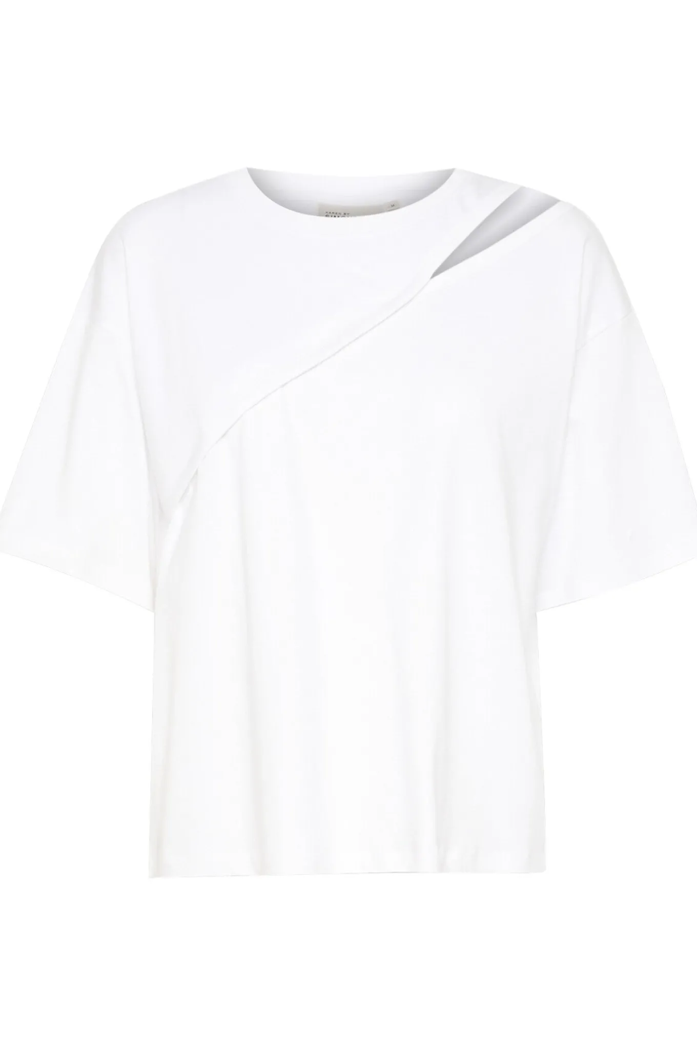 OBS! Fjernlager. Levering kan blive forlænget med 2-3 dage, hvis varen ikke findes i vores butik lige nu.Cool tee fra Karen By Simonsen med korte ærmer, rund hals og en smart udskæring over den ene skulder.