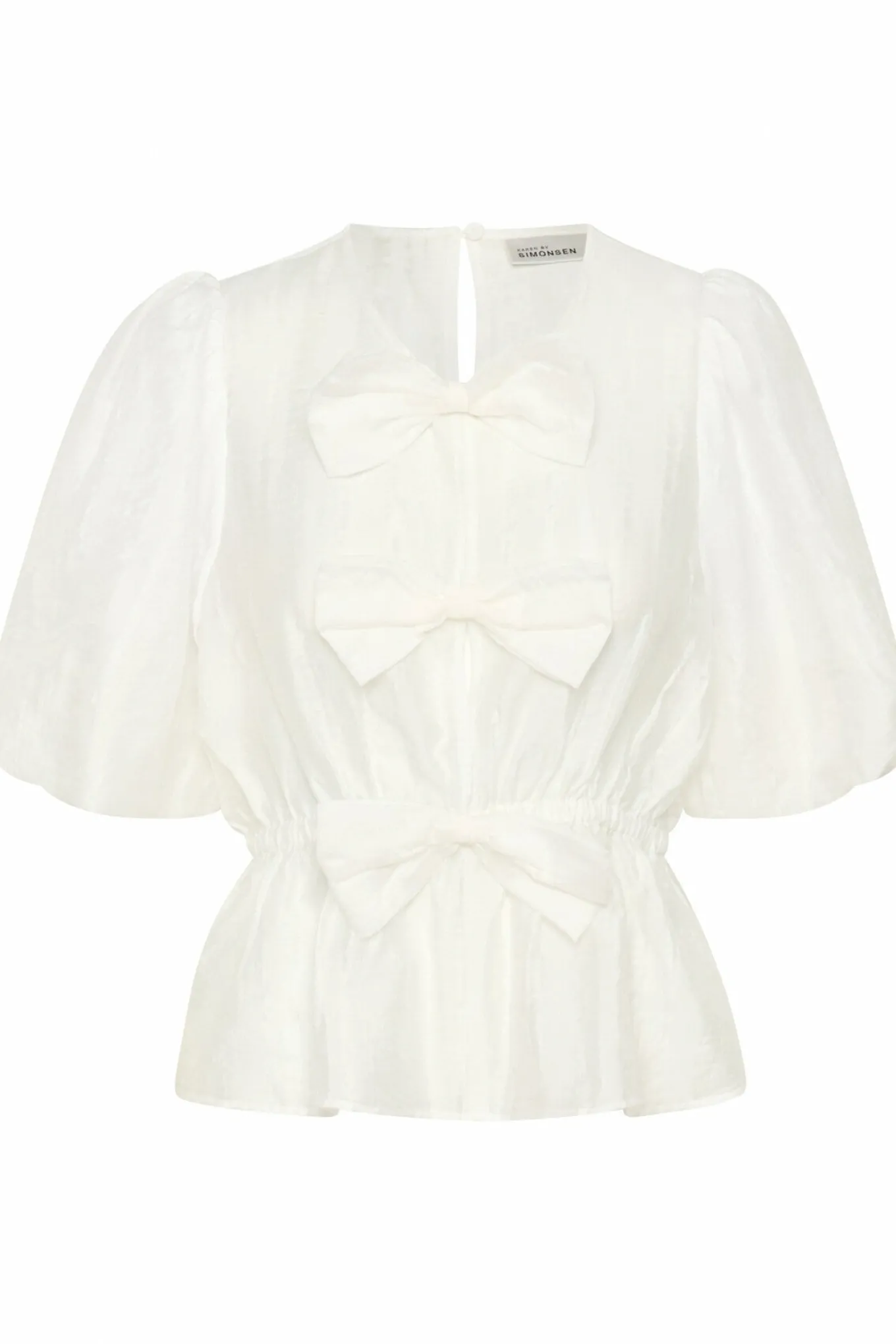 - OBS! Fjernlager. Levering kan blive forlænget med 2-3 dage, hvis varen ikke findes i vores butik lige nu.Feminin bluse fra Karen By Simonsen med korte pufærmer, v-udskæring i halsen og skønne store sløjfer langs fronten.Blusen har også elastik i taljen og en super fin silhuet.