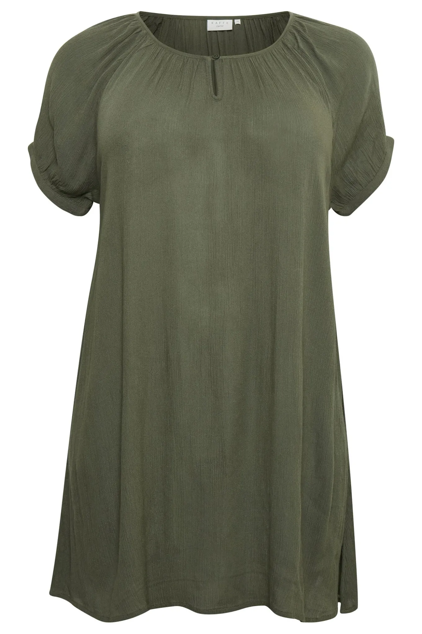 OBS! Fjernlager. Levering kan blive forlænget med 2-3 dage, hvis varen ikke findes i vores butik lige nu.Fin enkel tunika fra Kaffe Curve med korte ærmer, rund hals og en afslappet silhuet.