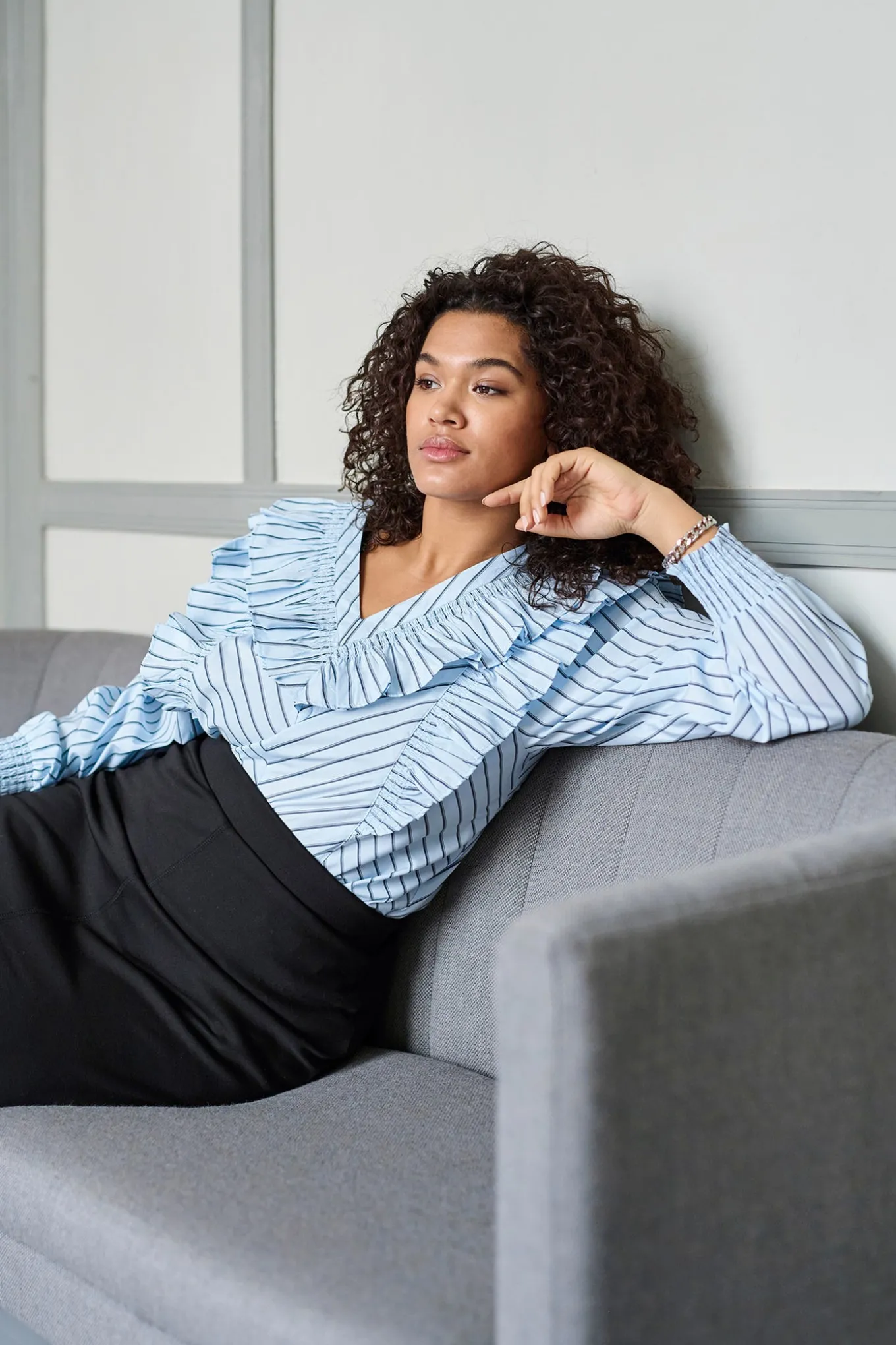 OBS! Fjernlager. Levering kan blive forlænget med 2-3 dage, hvis varen ikke findes i vores butik lige nu.Feminin bluse fra Kaffe Curve med lange pufærmer, tætsiddende smock manchetter og skønne flæser omkring skulderne og brystet.