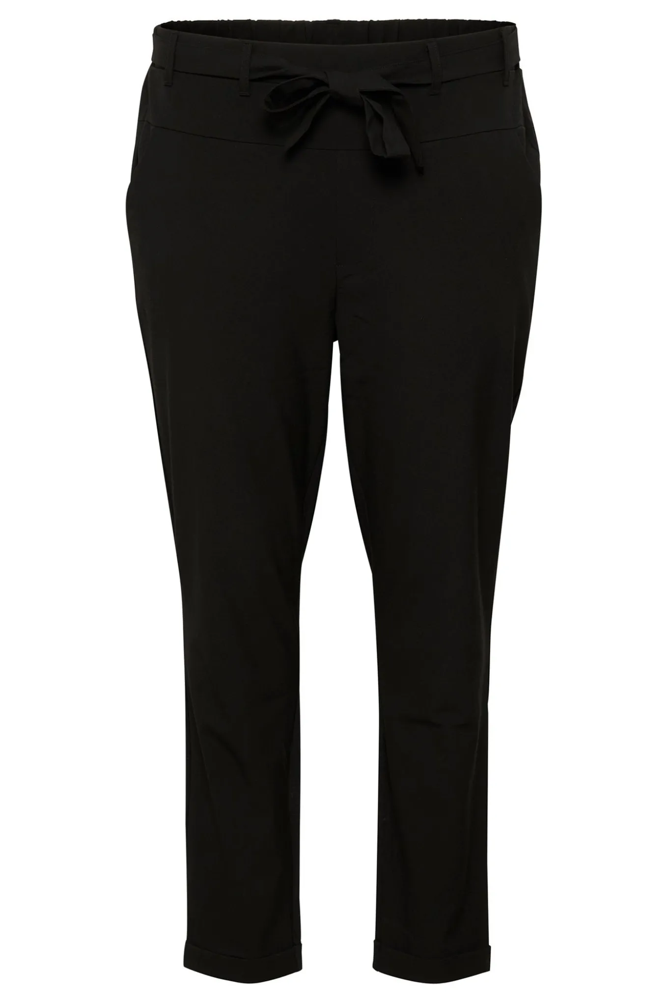 OBS! Fjernlager. Levering kan blive forlænget med 2-3 dage, hvis varen ikke findes i vores butik lige nu.Smarte bukser fra Kaffe Curve med elastikkant og bindebælte i taljen, en slim-leg silhuet og en lækker kvalitet.