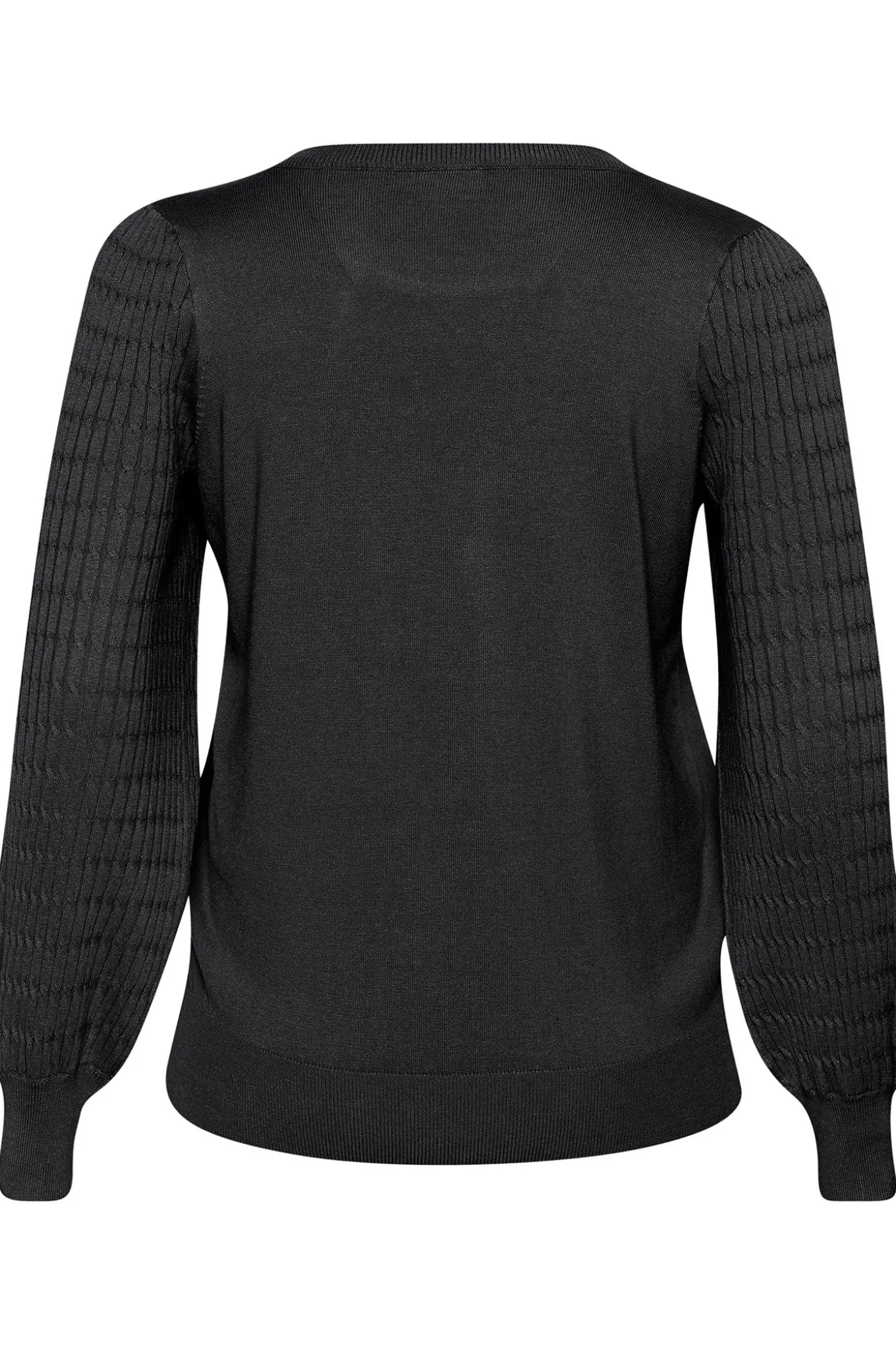 OBS! Fjernlager. Levering kan blive forlænget med 2-3 dage, hvis varen ikke findes i vores butik lige nu.Fin enkel strik fra Kaffe Curve med lange pufærmer, rund halsudskæring og fine detaljer i ærmerne.