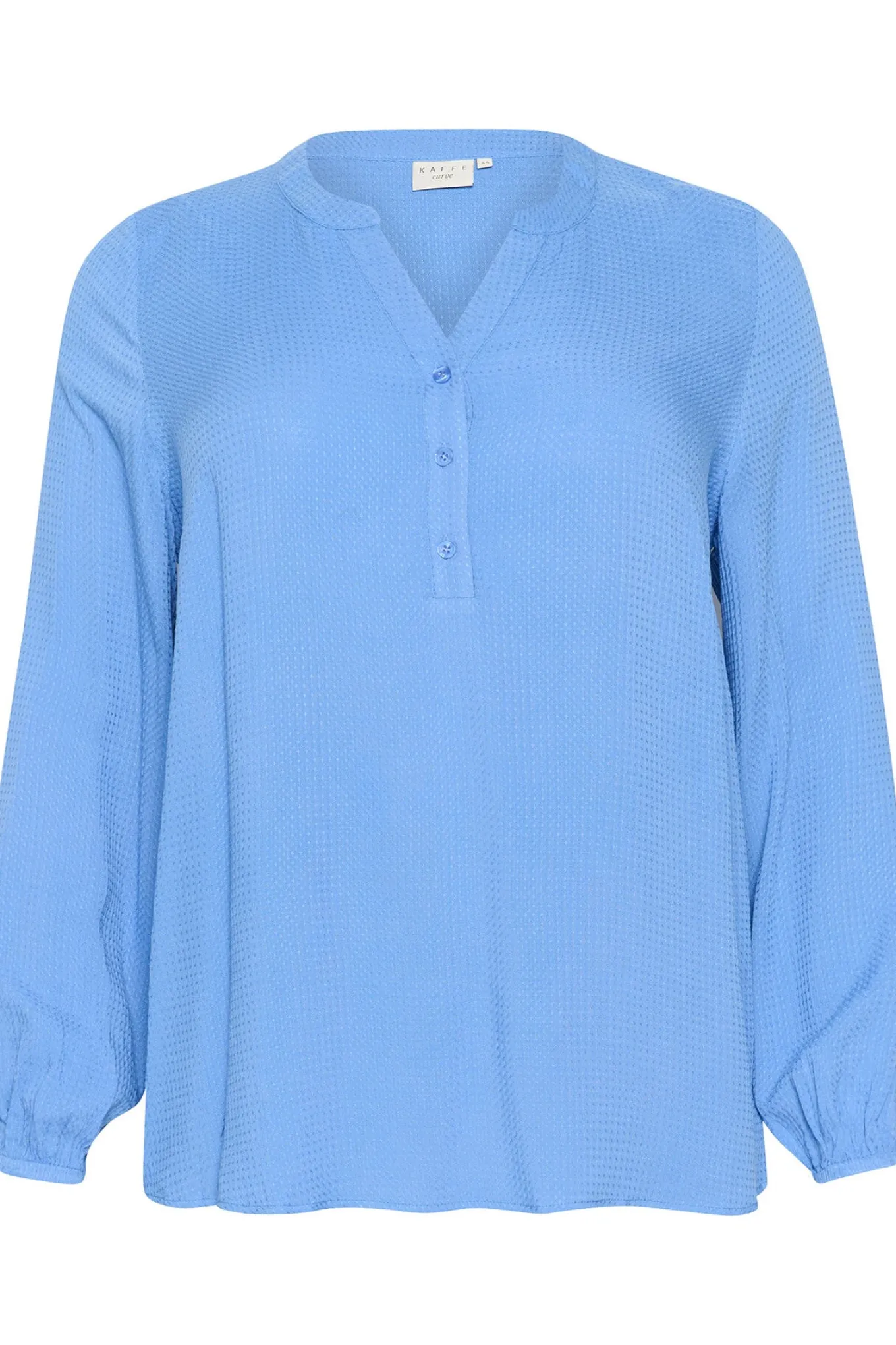 OBS! Fjernlager. Levering kan blive forlænget med 2-3 dage, hvis varen ikke findes i vores butik lige nu.Fin enkel bluse fra Kaffe Curve med lange ærmer, rund hals med v-udskæring og et kort knappanel over brystet.