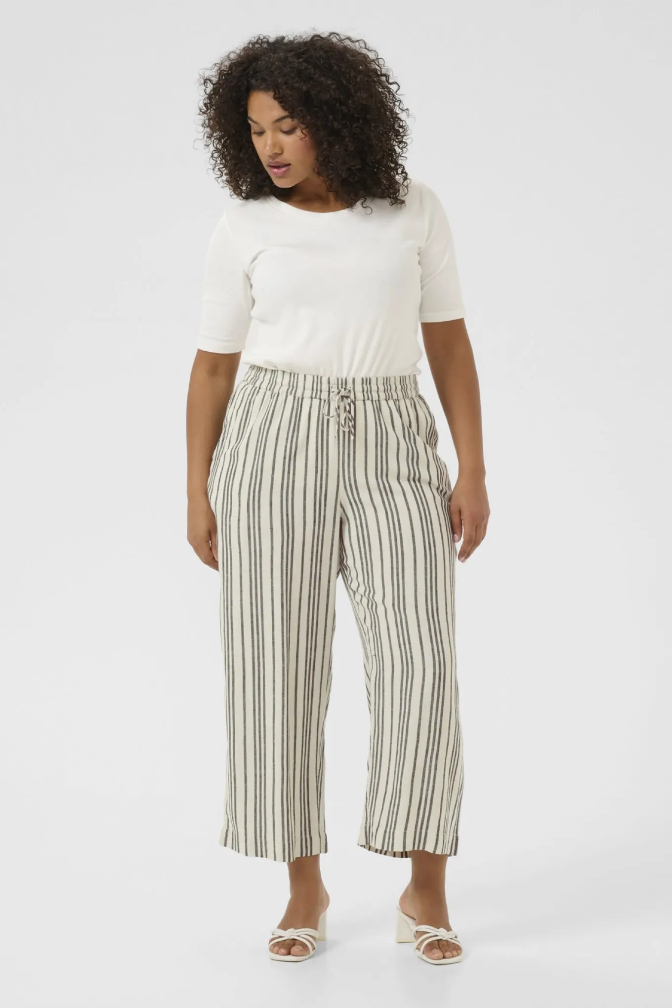OBS! Fjernlager. Levering kan blive forlænget med 2-3 dage, hvis varen ikke findes i vores butik lige nu.Smarte cropped bukser fra Kaffe Curve med en bred elastikkant og bindesnor i taljen, vidde i benene og en afslappet silhuet.