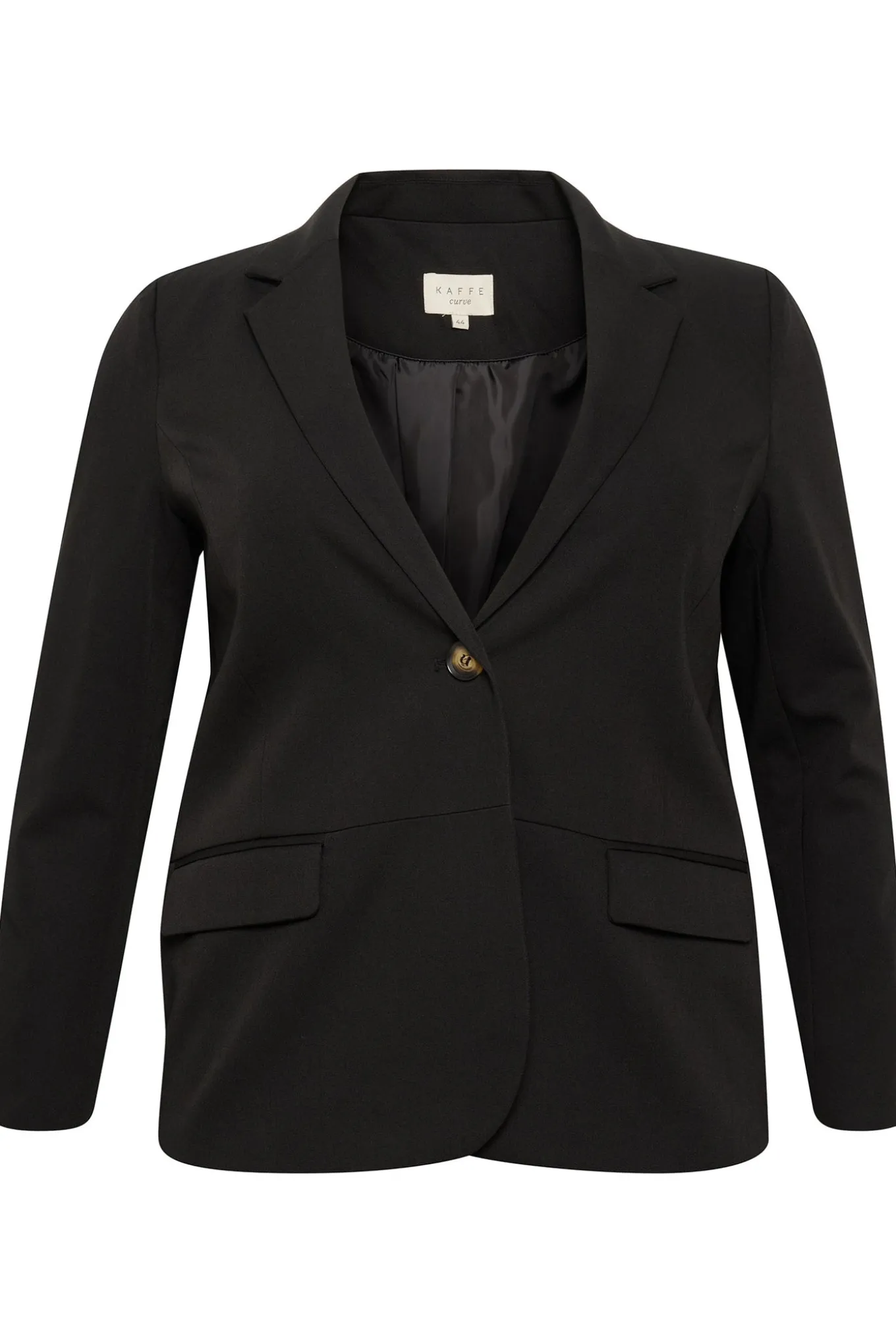 OBS! Fjernlager. Levering kan blive forlænget med 2-3 dage, hvis varen ikke findes i vores butik lige nu.Klassisk blazer fra Kaffe Curve med lange ærmer, v-udskæring med en smal krave i halsen og fine lommeflapper i siderne.Blazeren har også en let figursyet silhuet og knaplukning foran.