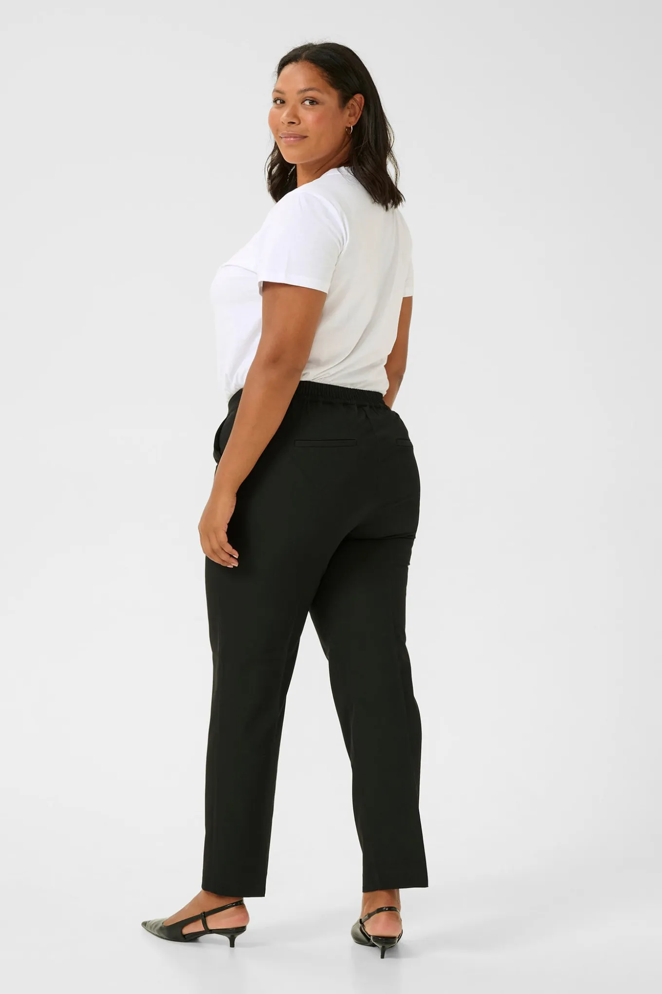 OBS! Fjernlager. Levering kan blive forlænget med 2-3 dage, hvis varen ikke findes i vores butik lige nu.Flotte bukser fra Kaffe Curve med et straight-leg snit, elastikkant i taljen og lommer i siderne. Bukserne har også en lækker kvalitet og fine pressefolder langs fronten.