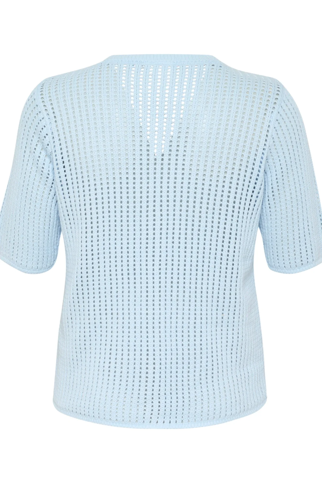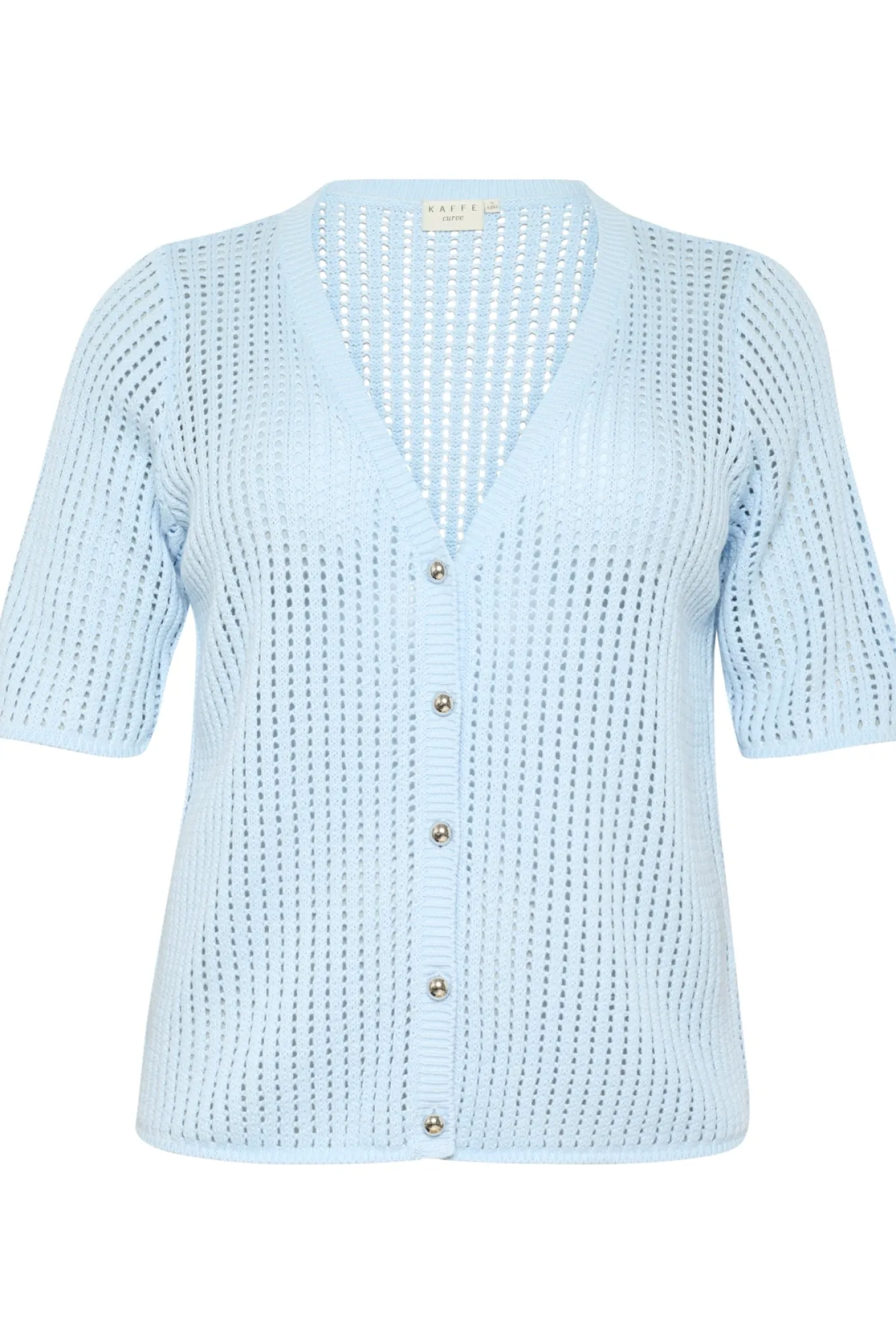 OBS! Fjernlager. Levering kan blive forlænget med 1-2 dage, hvis varen ikke findes i vores butik lige nu.Sød strik fra Kaffe Curve med ½ lange ærmer, v-udskæring i halsen og små knapper langs fronten.Strikken har også et super fint hullet mønster.