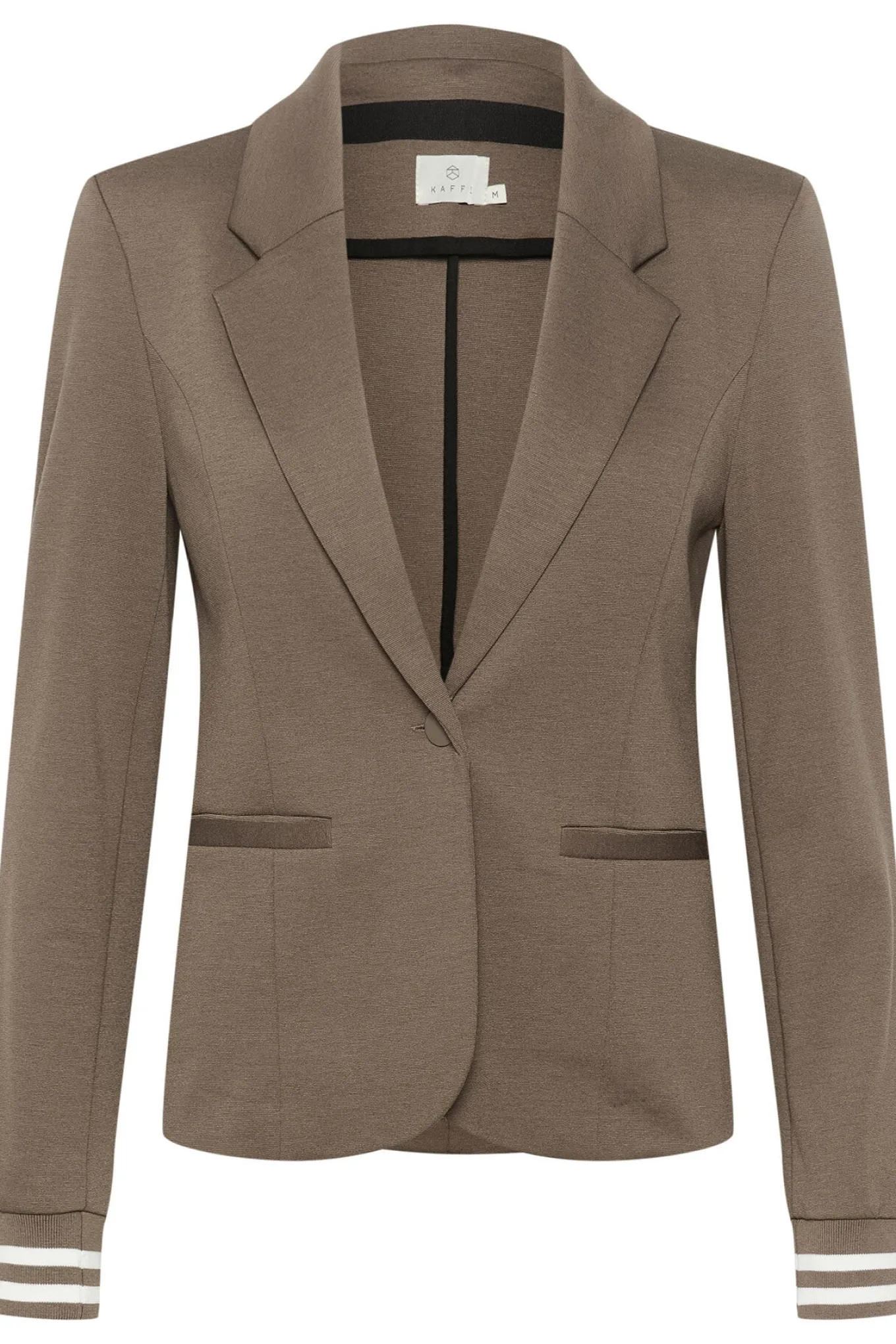 OBS! Fjernlager. Levering kan blive forlænget med 2-3 dage, hvis varen ikke findes i vores butik lige nu.Flot blazer fra Kaffe med et lille sporty touch.Blazeren har en flot klassisk silhuet, åbentstående krave og en lækker kvalitet. Den er også detaljeret med smarte farverige striber i foret og i bunden af ærmerne.