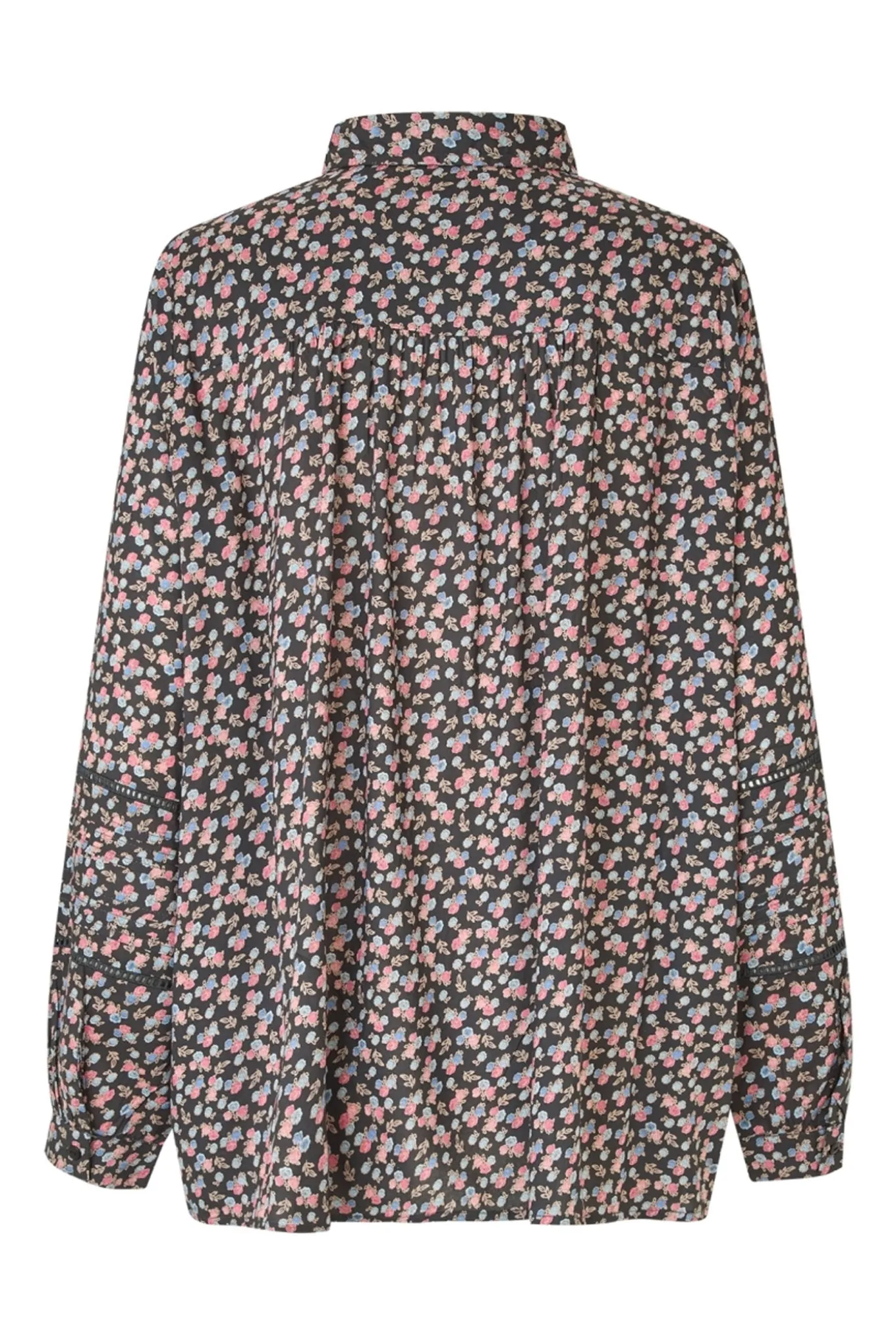 Feminin og ubesværet elegant stil med et vintage-inspireret blomsterprint i bløde toner af pink, blå og beige på en mørk base. Skjorten her fra Lollys Laundry er lavet af 100% blød viskose og har en løs pasform med delikate rynker, der giver den et smukt fald.