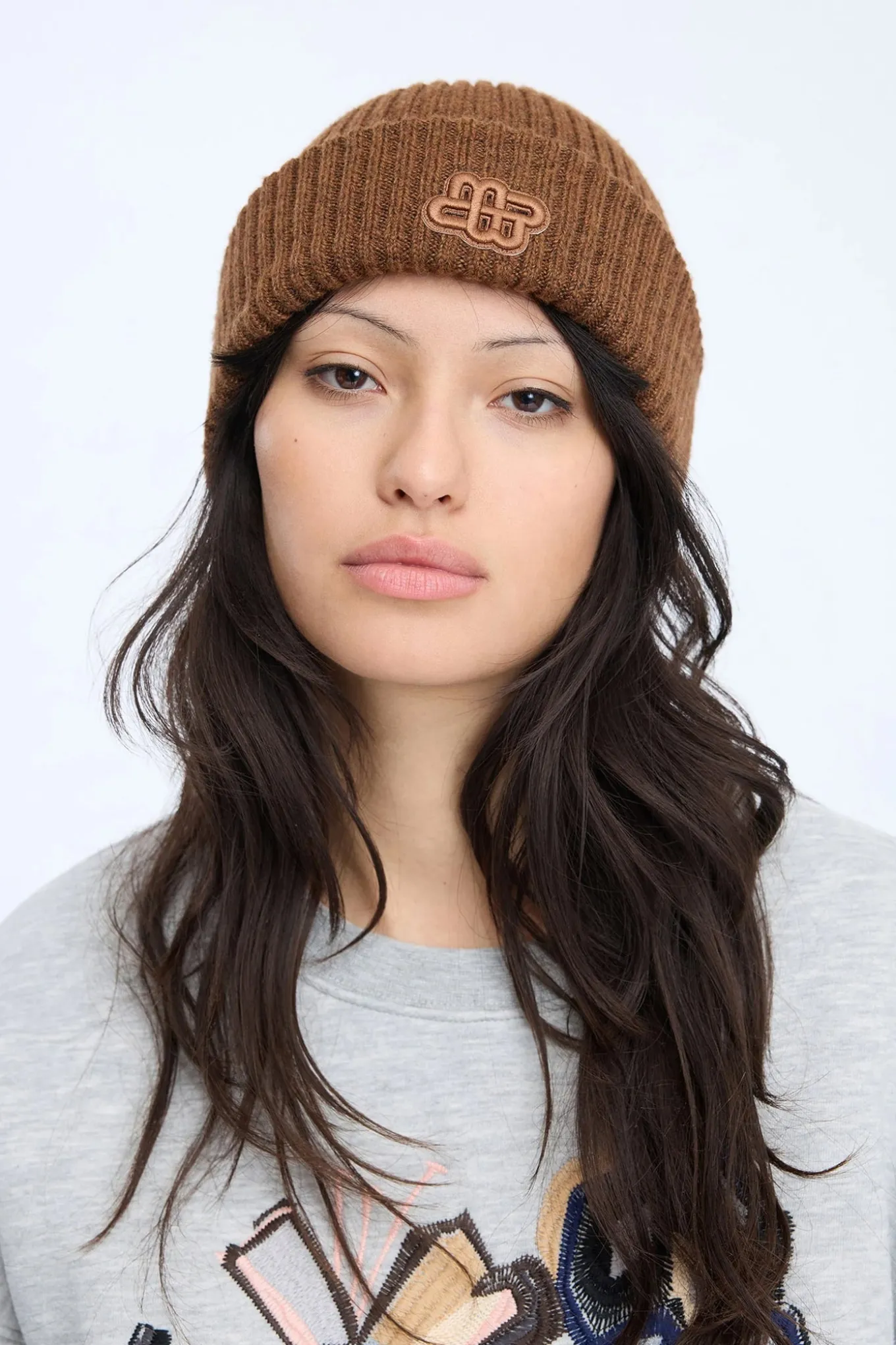 Blød og varm ribstrikket hue med opsmøg og tone-i-tone broderet logo.