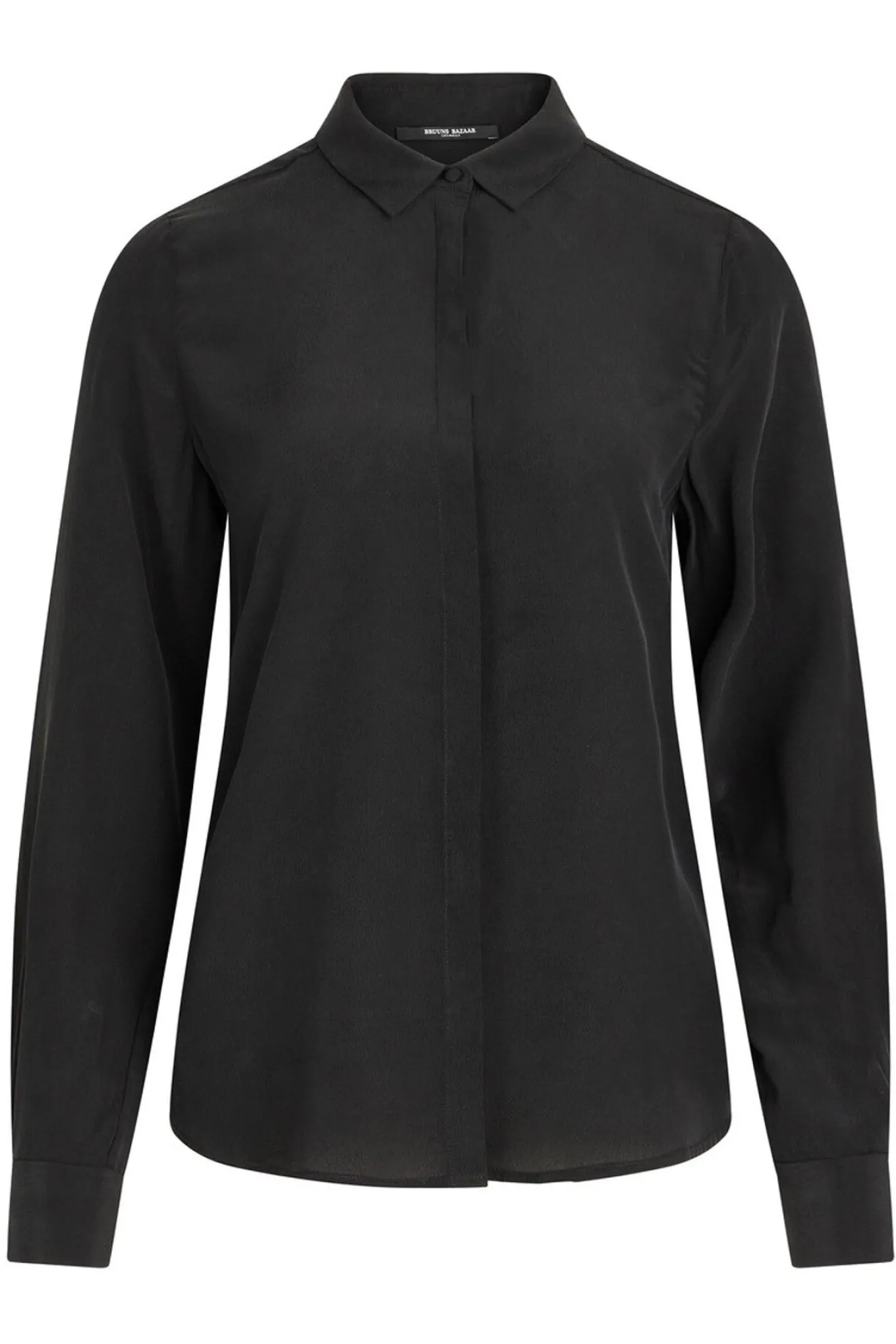 OBS! Fjernlager. Levering kan blive forlænget med 2-3 dage, hvis varen ikke findes i vores butik lige nu.Elegant silke skjorte fra Bruuns Bazaar med lange ærmer, en lille krave i halsen og skjult knaplukning langs fronten.