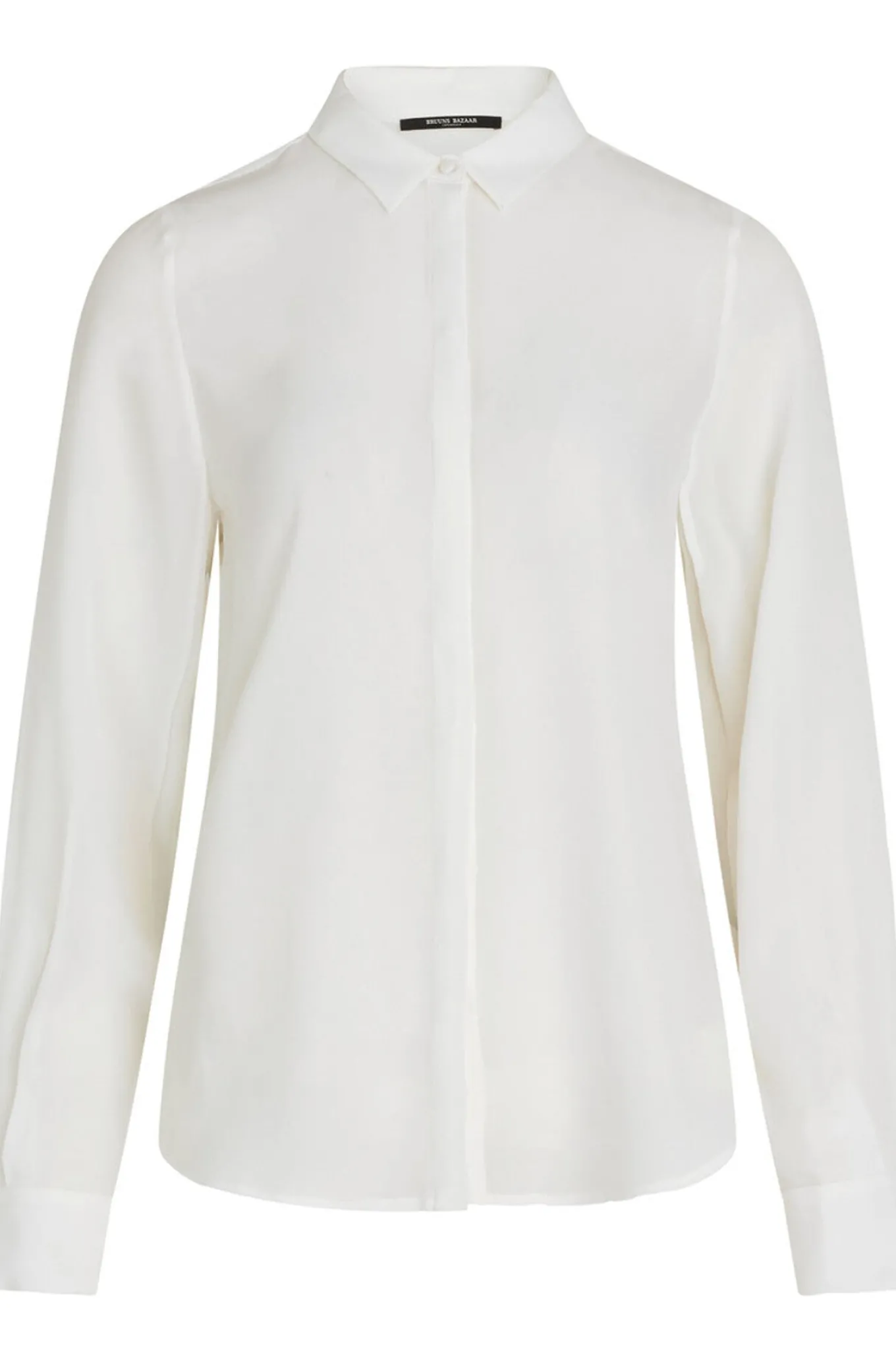 - OBS! Fjernlager. Levering kan blive forlænget med 2-3 dage, hvis varen ikke findes i vores butik lige nu.Elegant silke skjorte fra Bruuns Bazaar med lange ærmer, en lille krave i halsen og skjult knaplukning langs fronten.