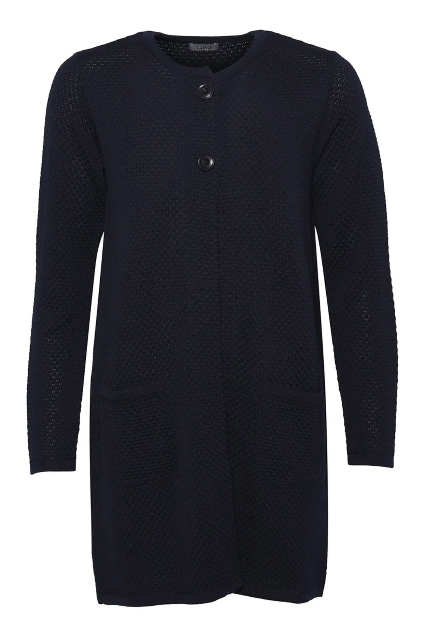 Vælg denne klassiske cardigan fra Lind for et tidløst og elegant look. Den er lavet af en blanding af uld og akryl i en flot navy farve.