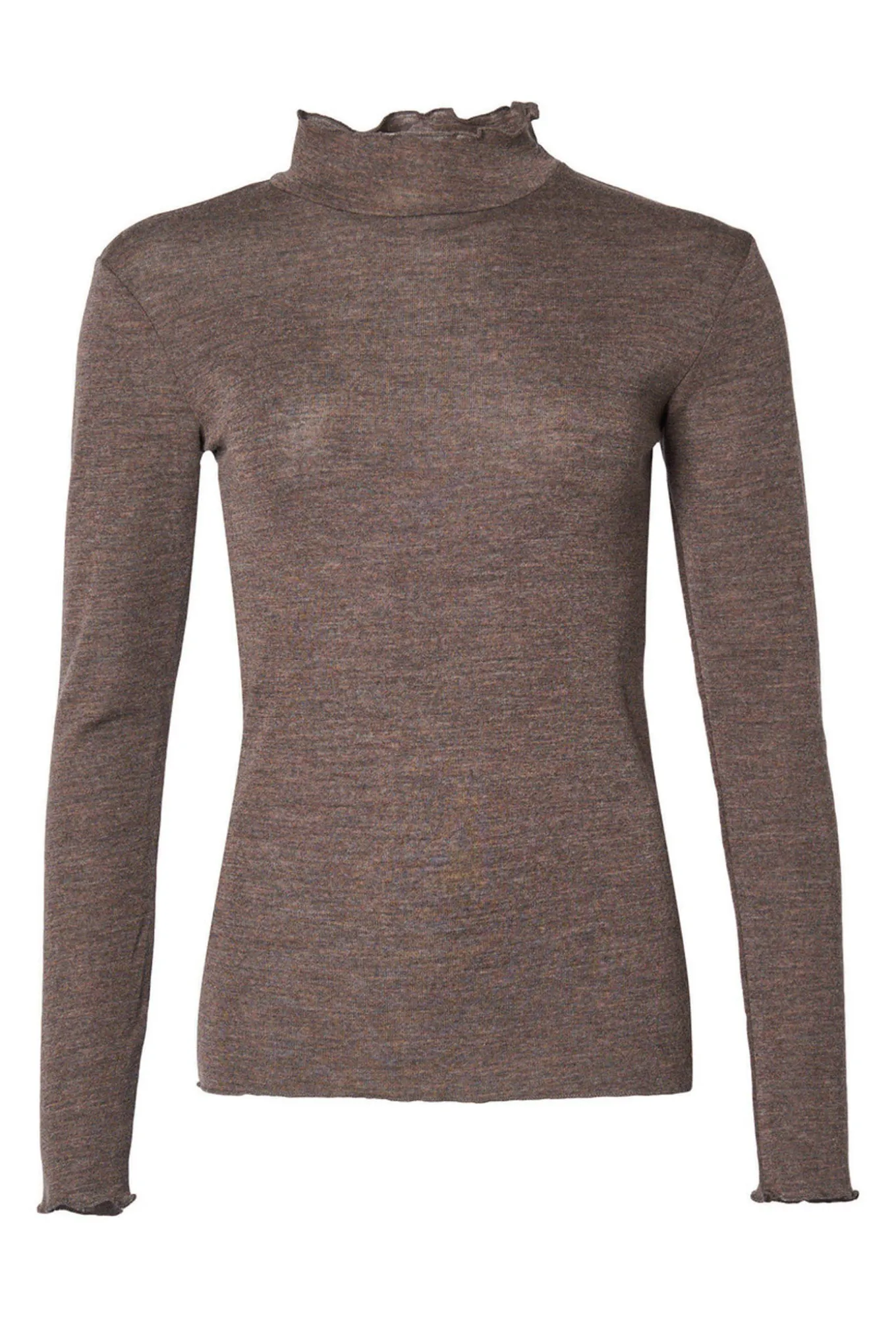 Forkæl dig selv med en varm og stilfuld 100% uld top fra LIND. Den brune melange farve giver et elegant touch til enhver garderobe.