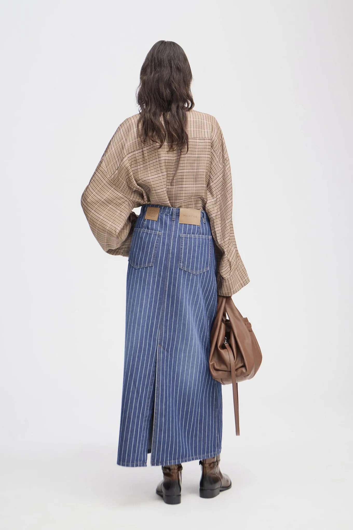 OBS! Fjernlager. Levering kan blive forlænget med 2-3 dage, hvis varen ikke findes i vores butik lige nu.Elegant, stribet denimnederdel med lommer og en smuk knaplukning foran. Denne alsidige nederdel kan styles lukket eller med nogle af knapperne foran åbnet.