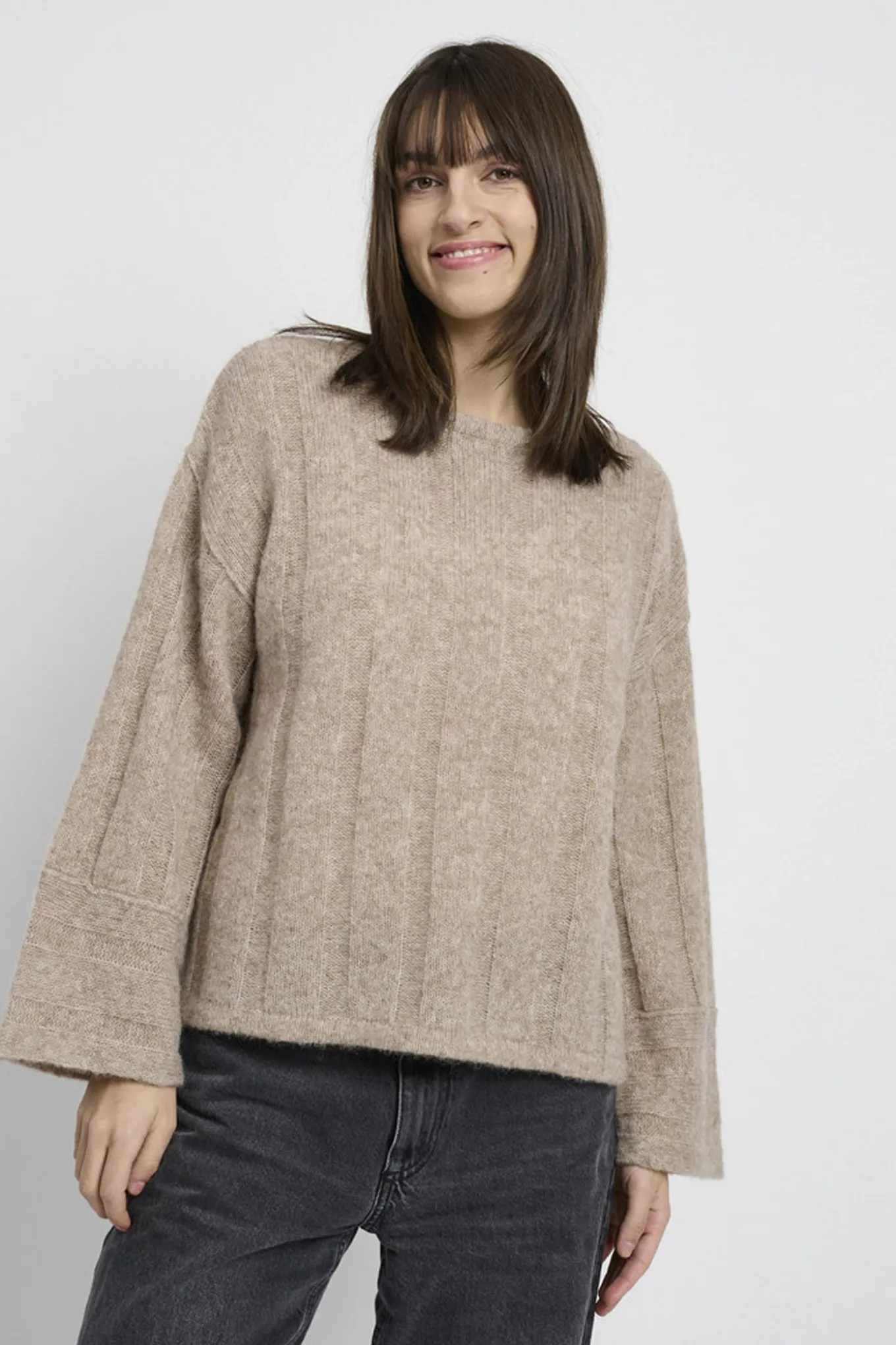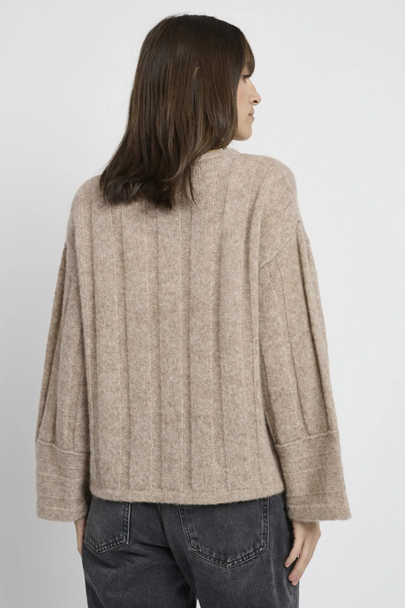 Skab et tidløst og elegant look med denne strik fra LIND. Den lysebrune melange farve tilføjer varme og hygge til dit outfit. Fremstillet af en blanding af alpaca, uld og poly.