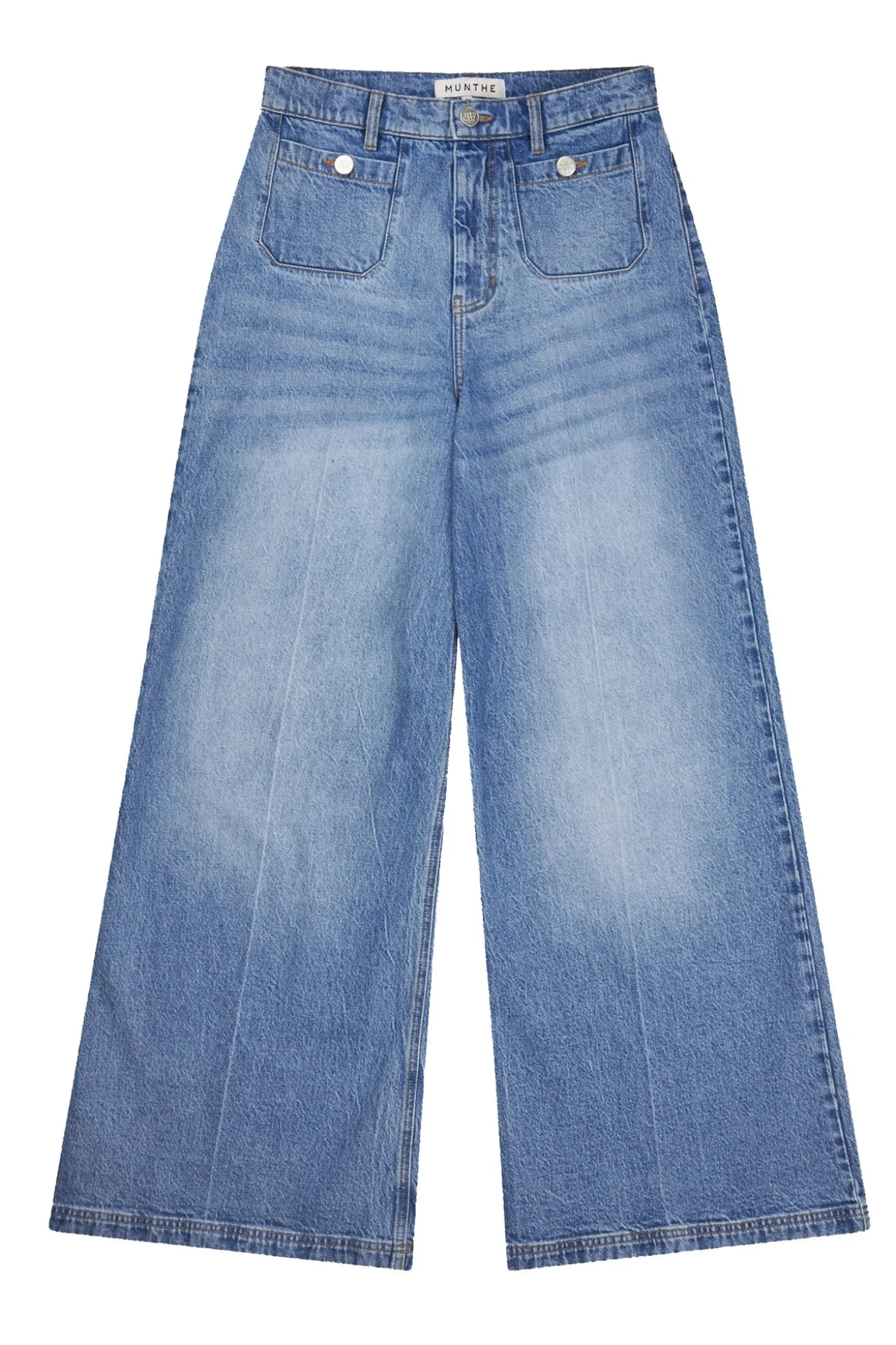 OBS! Fjernlager. Levering kan blive forlænget med 2-3 dage, hvis varen ikke findes i vores butik lige nu.Denim bukser med pressefolder, to fine lommer foran, der kan lukkes med en knap, samt to baglommer. Disse denim bukser har en elegant MUNTHE-læderpatch bagpå og lukkes med lynlås og en enkelt knap.