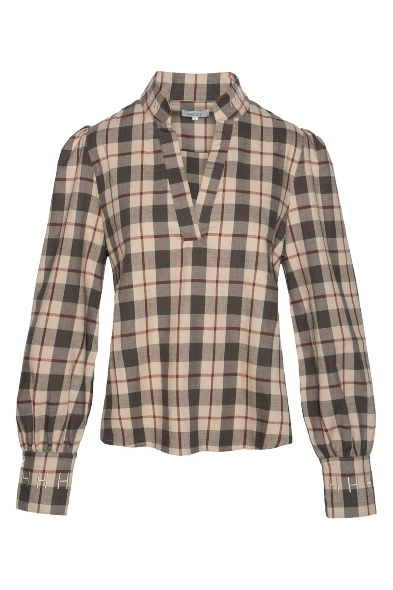 Feminin skjortebluse fra Hést med lange ærmer, kinakrave med v-udskæring og et flot ternet print.