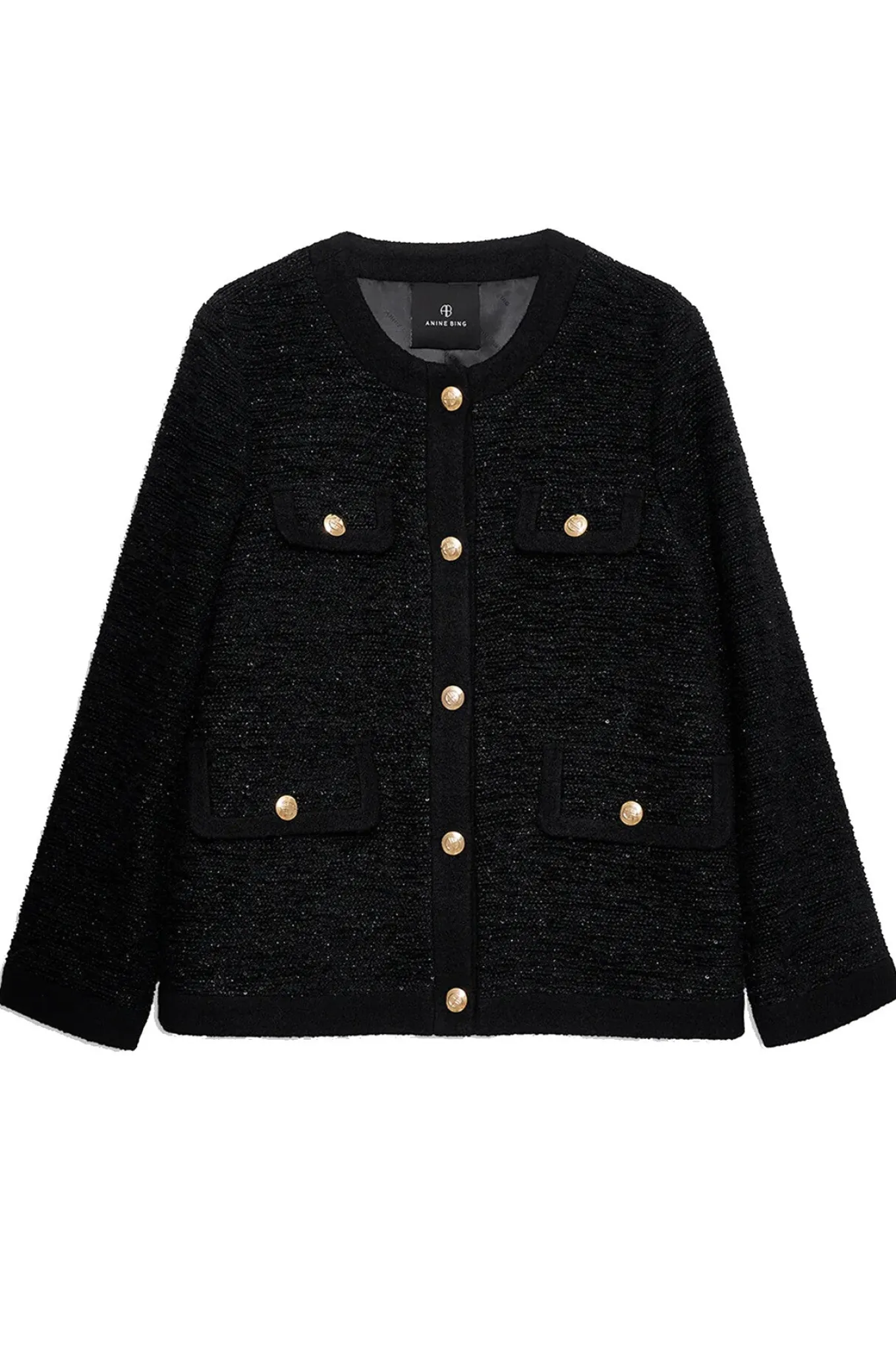Flot jakke fra Anine Bing med lange ærmer, rund halsudskæring og smukke guldknapper.Jakken har også en super lækker kvalitet med lette glimmereffekter og små pailletter.