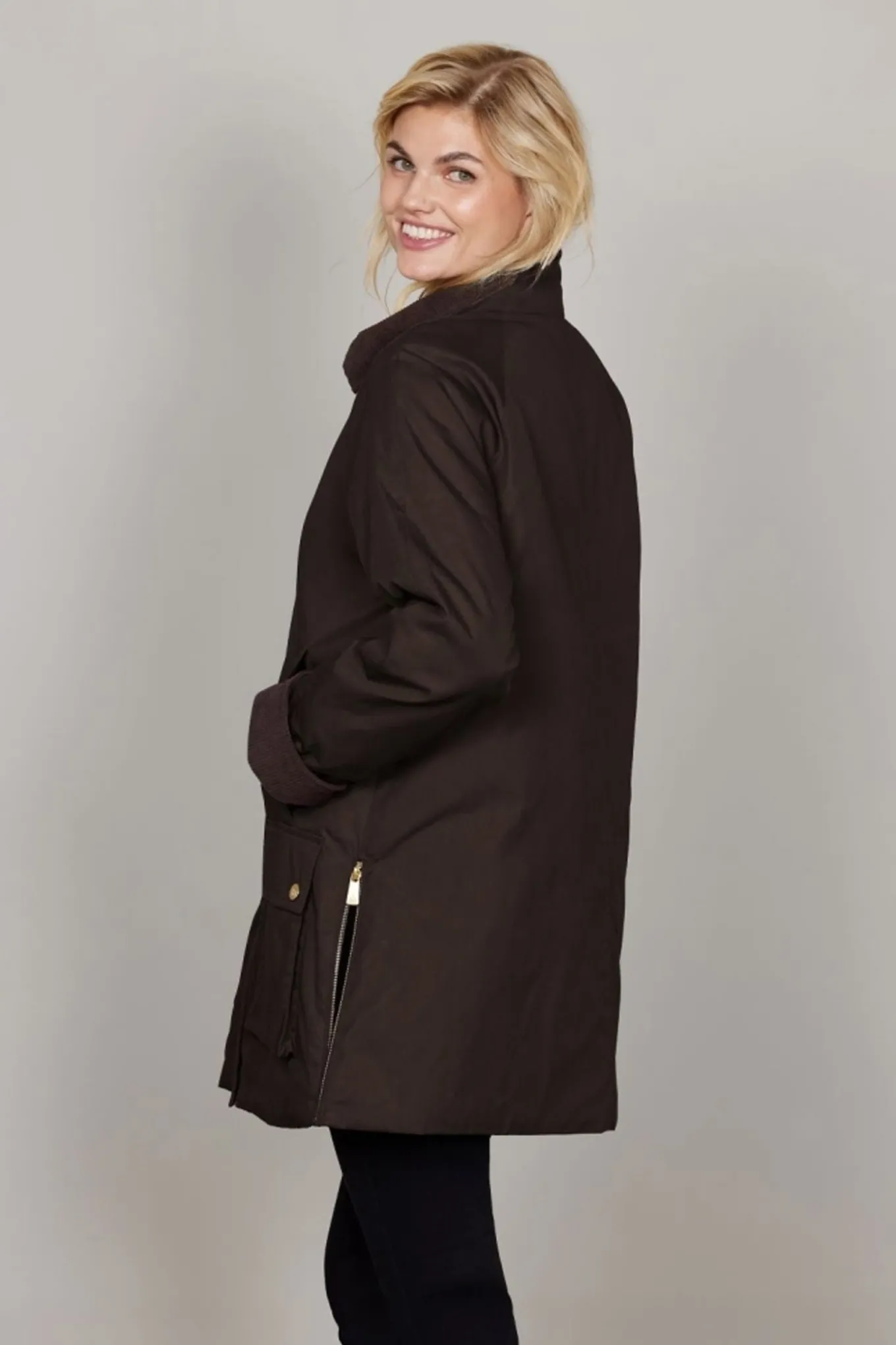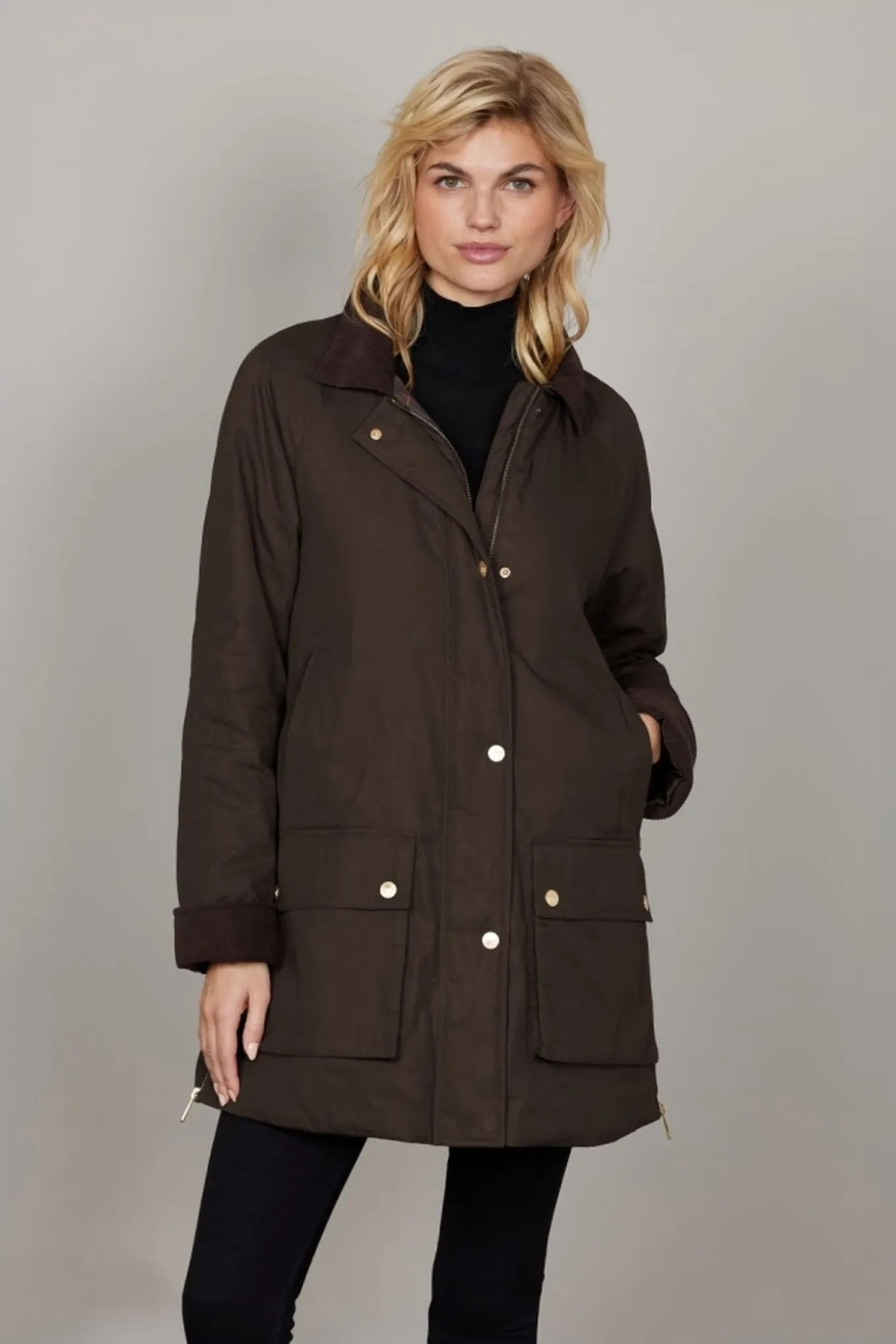 Jakken er foret med et smukt ternet stof i kroppen, suppleret med elegant messingfarvet metaltilbehør, der tilføjer et raffineret og sofistikeret touch.Marianne lukkes med både lynlås og knapper, hvilket giver ekstra beskyttelse mod elementerne.