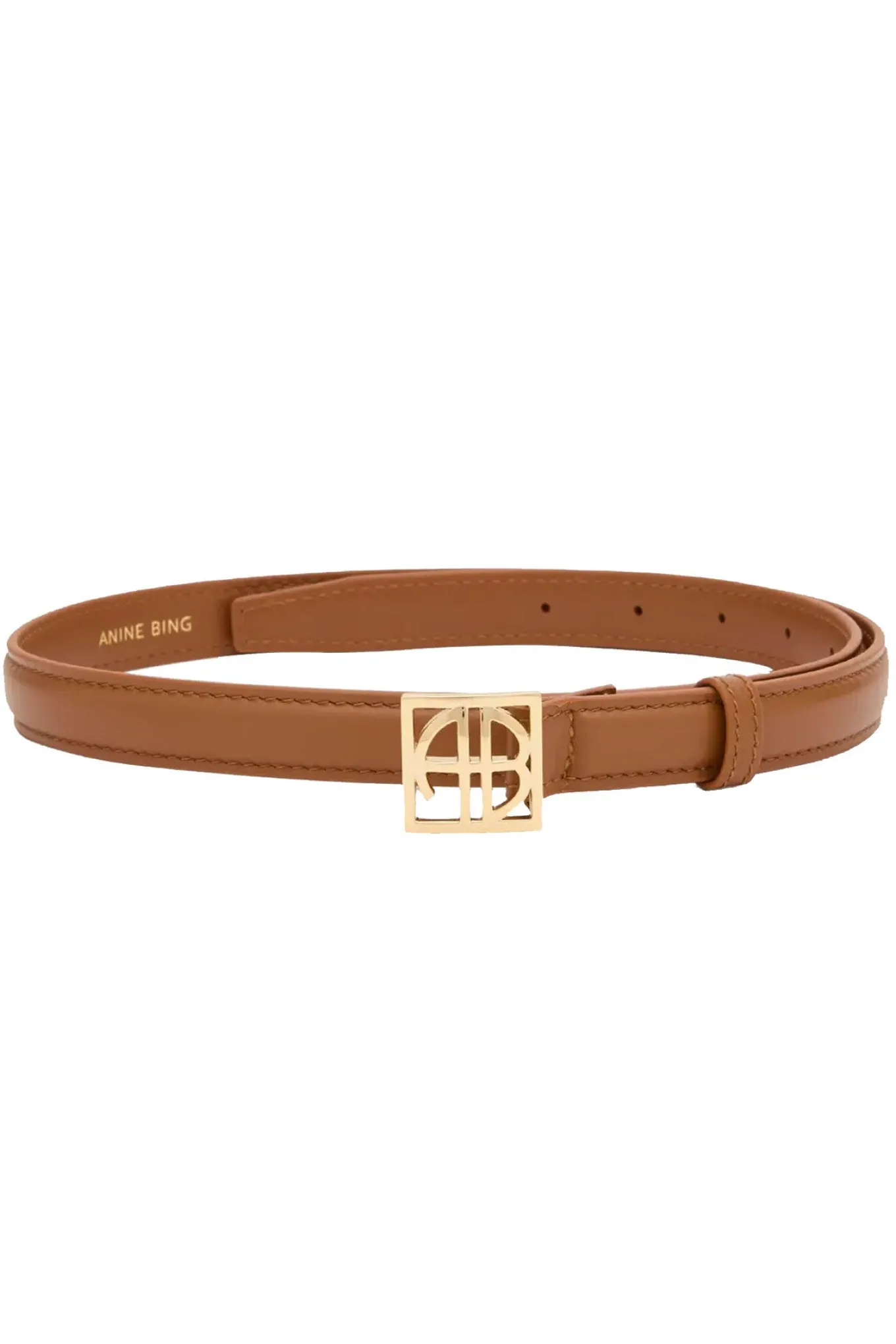 - OBS! Fjernlager. Levering kan blive forlænget med 2-3 dage, hvis varen ikke findes i vores butik lige nu.Elegant bælte fra Anine Bing med et smukt monogram spænde.