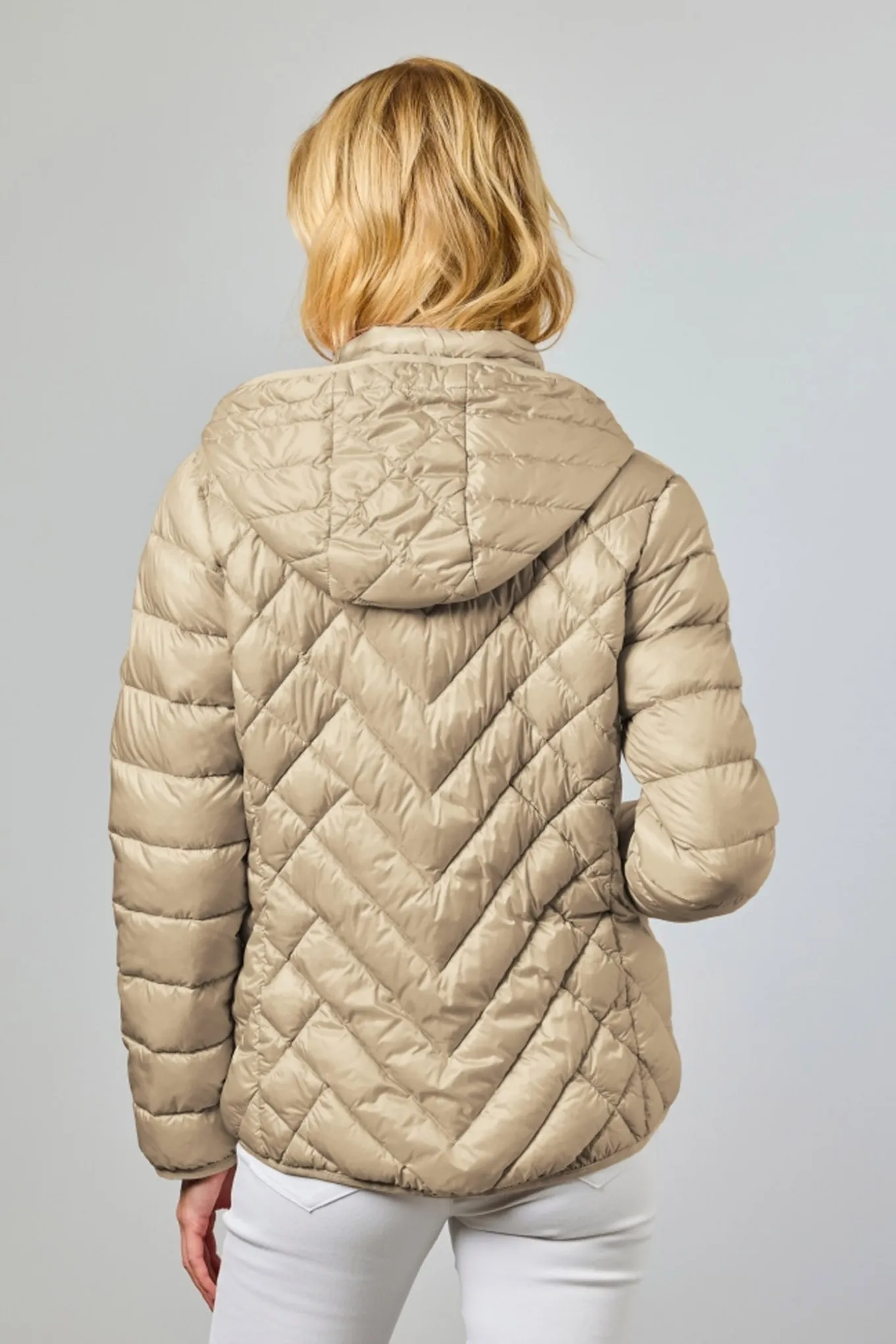 Det diagonale quiltede mønster tilfører en moderne design til det enkle snit, mens fine detaljer som denim-look bånd ved lynlåse foran og på lommerne giver et diskret, stilfuldt præg.