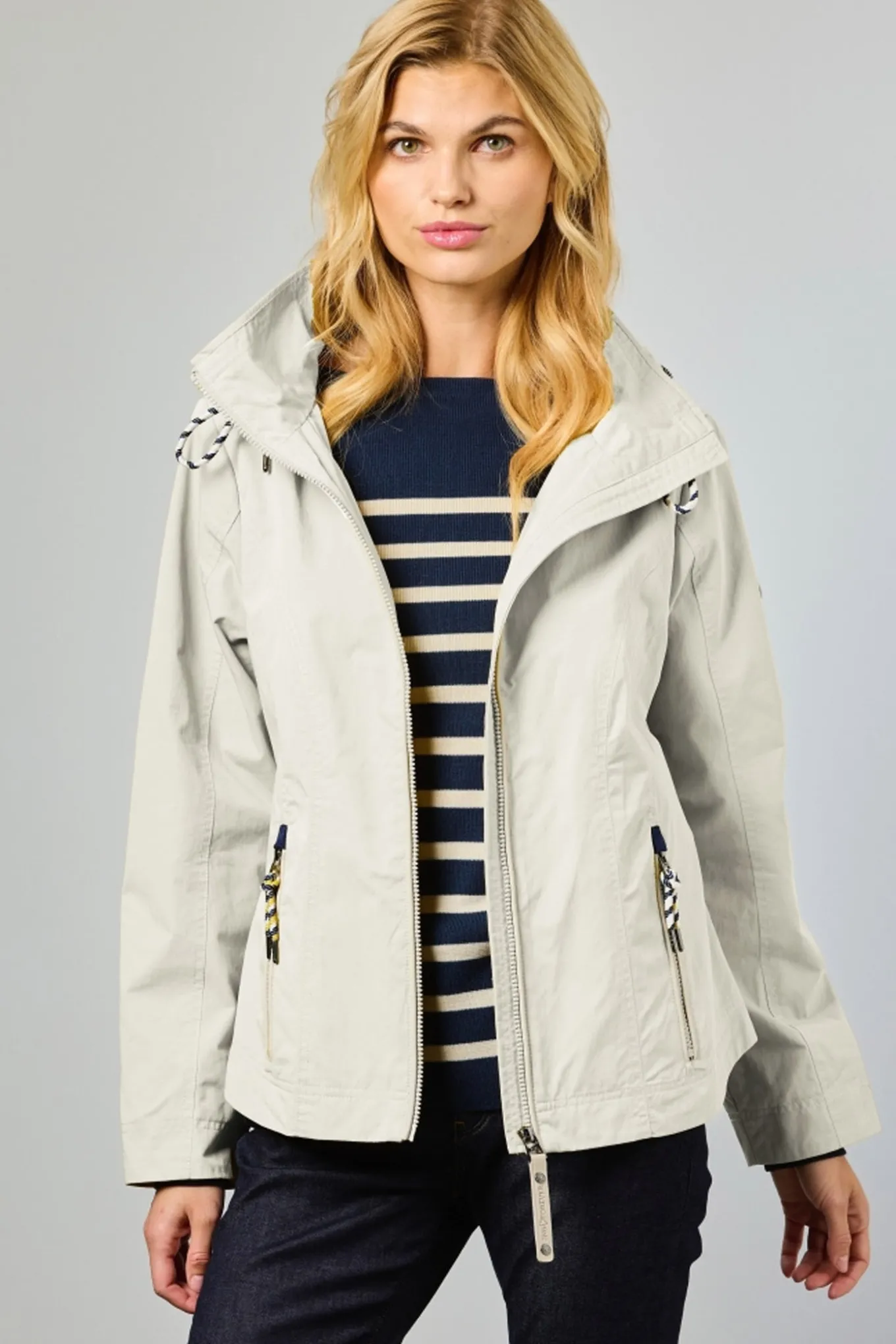 Navy- og hvid piping fremhæver det maritime udtryk, mens den aftagelige hætte med justerbar snøre tilføjer funktionalitet og fleksibilitet.
