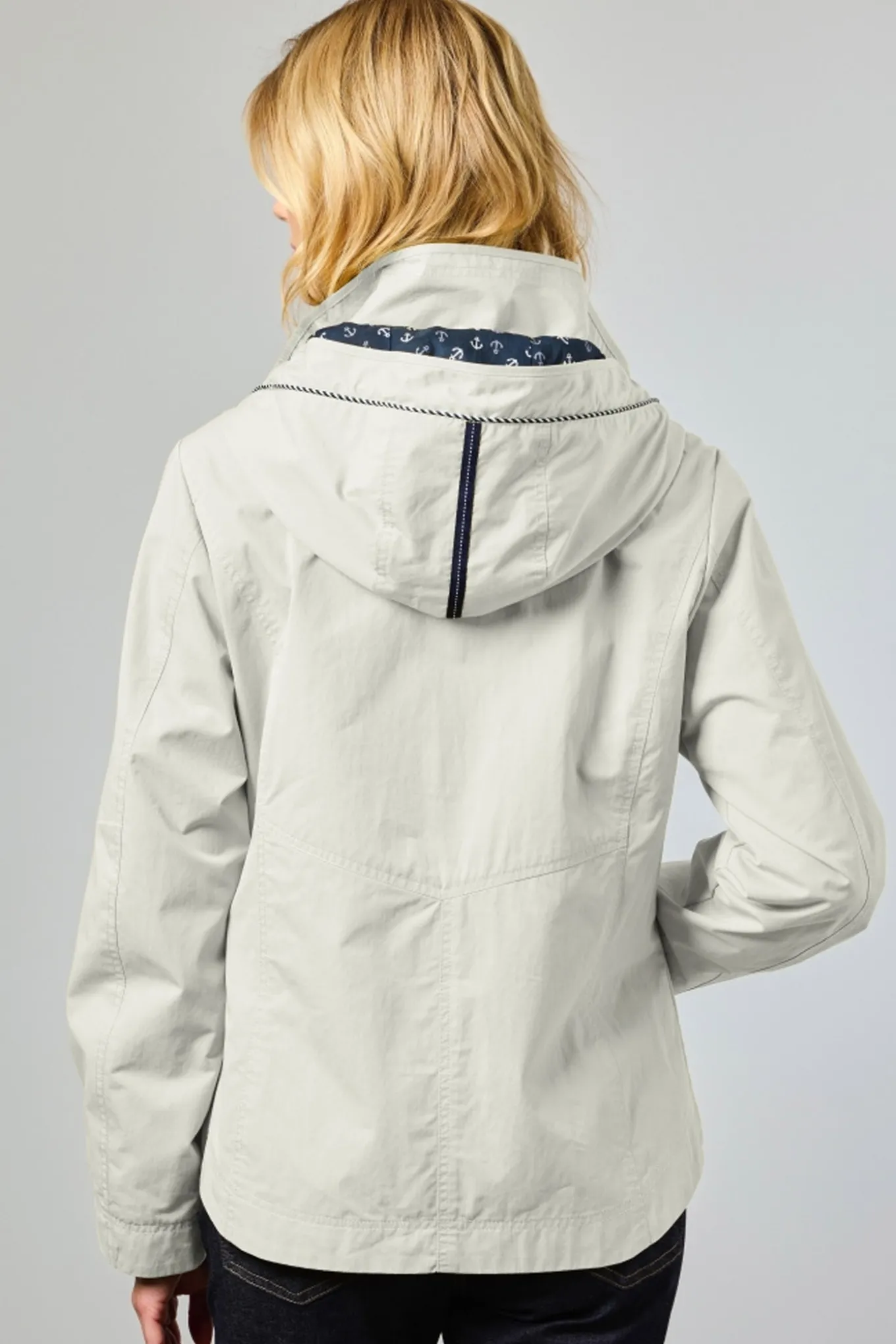 Indvendigt er jakken halvforet, og både krop og hætte er forsynet med et charmerende ankerprint, der tilfører et frisk og legende præg.