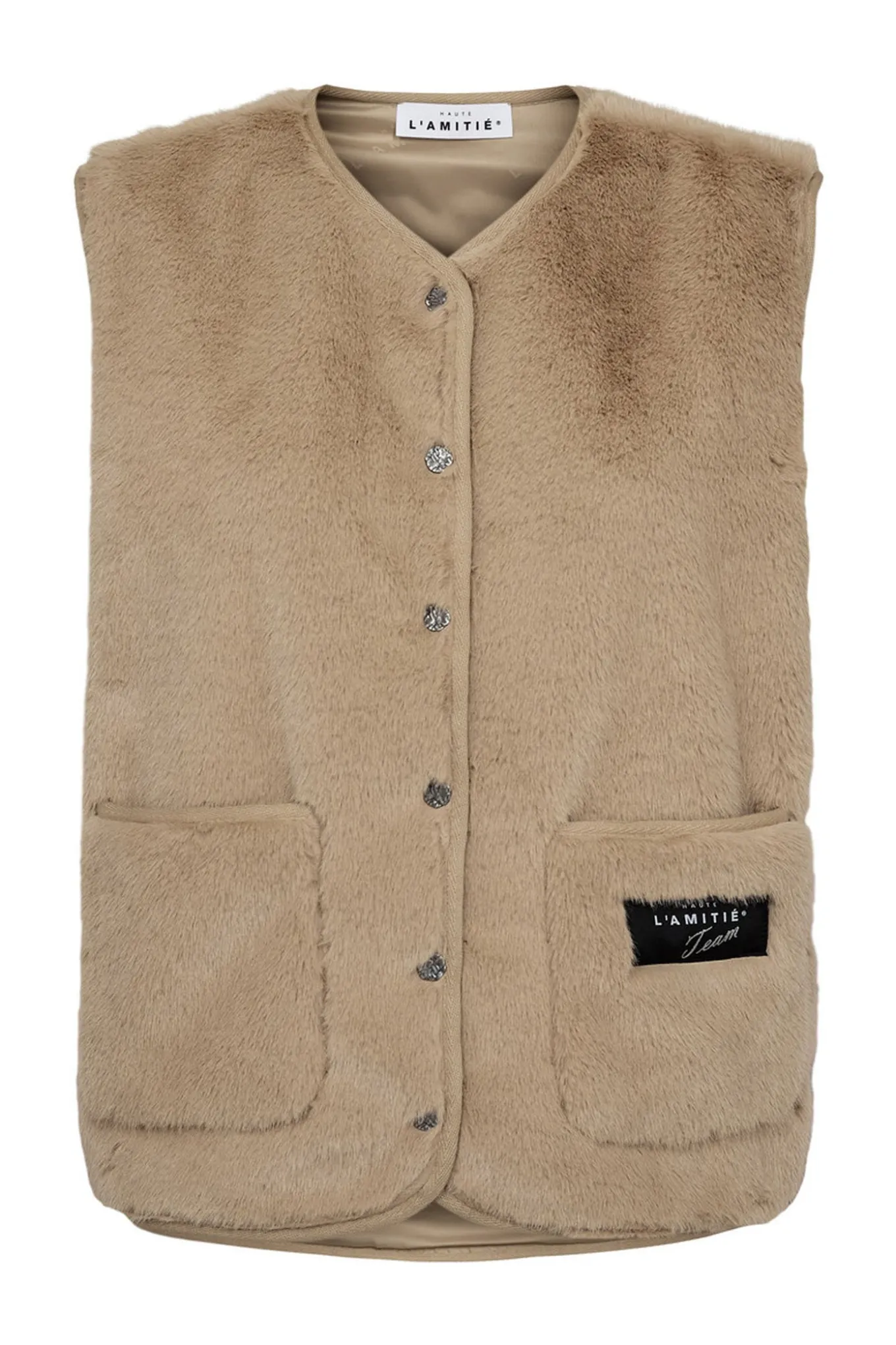 Opgrader din garderobe med denne beige Fur Tech vest fra Haute L’amitie. Lavet af 100% polyester, giver den ekstra varme og stil til ethvert outfit.