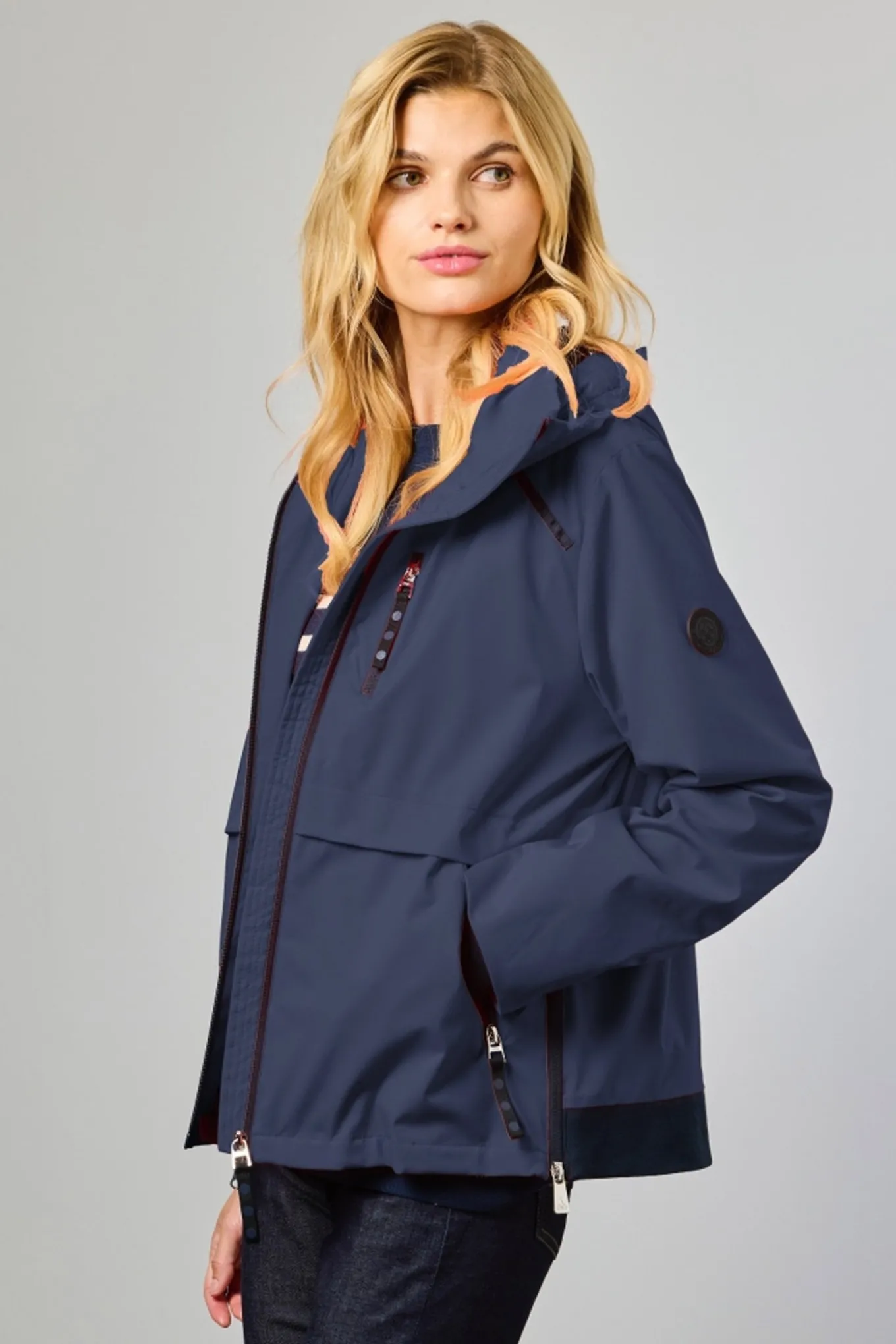 Designet til både funktionalitet og stil skiller denne moderne korte jakke sig ud med sine skarpe kontrastdetaljer og sporty silhuet.Den dobbeltlags krave skjuler en aftagelig hætte, som nemt kan lynes af mellem lagene for et rent look.En bomberinspireret ribbeplade bagpå og en lynlåsslids ved sidesømmen giver jakken et urbant præg, mens vindmanchetter i ærmerne hjælper med at holde kulden ude.Praktiske funktioner inkluderer lynlåslommer foran, en lynlås i midten foran samt kontrastfarvede bånd og kanter overalt.Et reflekterende print på motorhjelmen tilføjer en diskret sikkerhedsdetalje, ideel til svagt lys.Fremstillet af mekanisk elastisk polyester giver stoffet bevægelsesfrihed, og en TPU-laminering på bagsiden sikrer en vandafvisende finish, hvilket gør det perfekt til overgangsvejr.Detaljer: Skal:100% polyester med mekanisk stræk- For: 100% polyester- Vandafvisende med TPU-laminering på bagsiden- Dobbelt lag krave med aftagelig hætte (lynlås mellem lagene)- Ribbeklædt bomber-rygpanel- Sidesøm lynlåsspalte- Windcuffs indvendigt på ærmerne- Reflekterende print på hætten- Lynlåslommer foran og lynlåsi midten foran- Kontrastbånd og detaljering overaltPasform: Komfort PasformMidterryg længde: 62 cmModellen har størrelse 38Højde: 180 cmBarm: 84 cmTalje: 60 cmHofter: 89 cmPlejevejledning:Skånsom vask ved 30°C