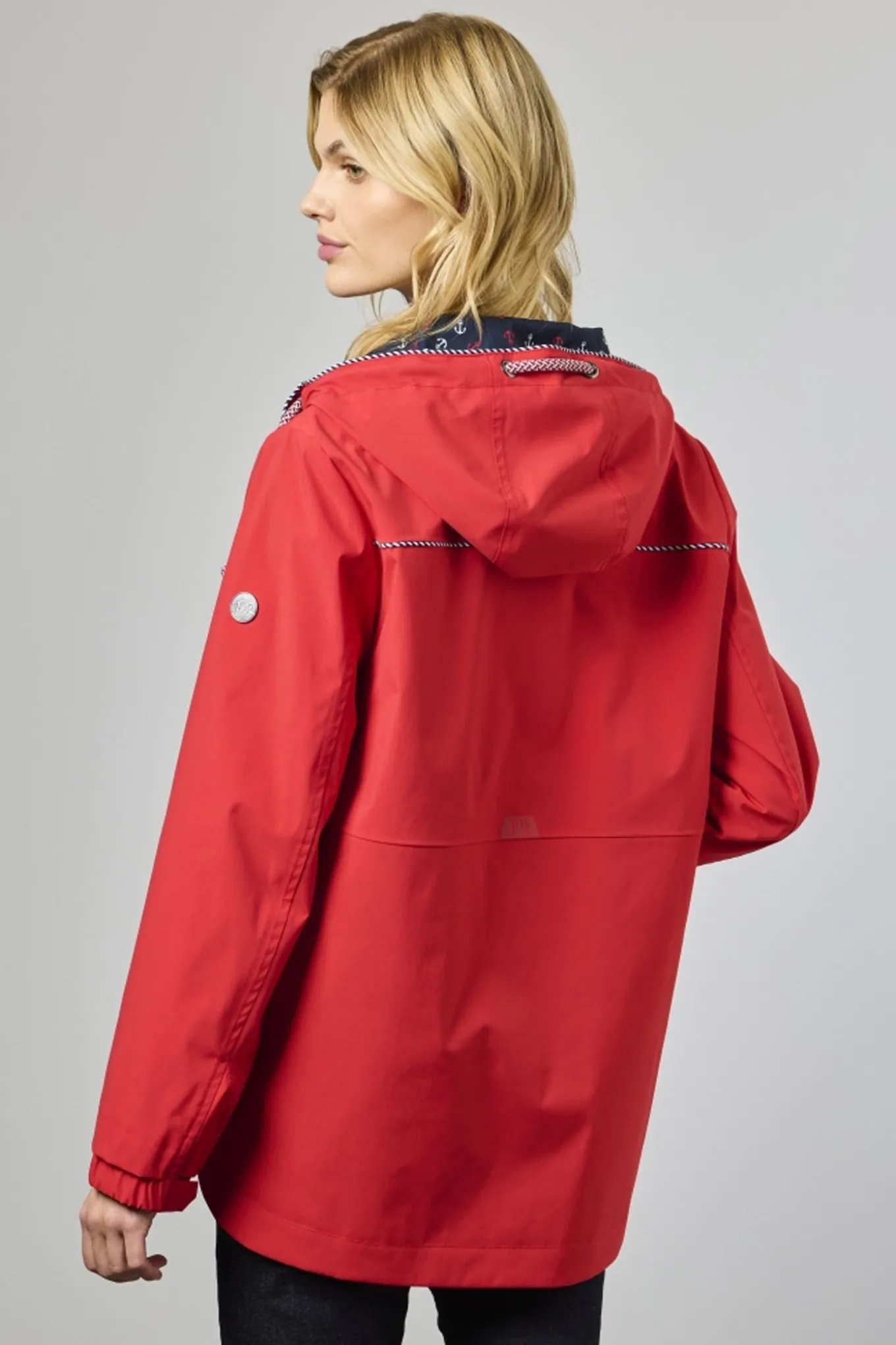 Indvendigt er jakken foret med smukt ankerprint i navy og hvid på overkroppen, hætten og nederste kant, mens den nederste del af jakken er foret med navy- og hvide striber – et stilfuldt og gennemført look.