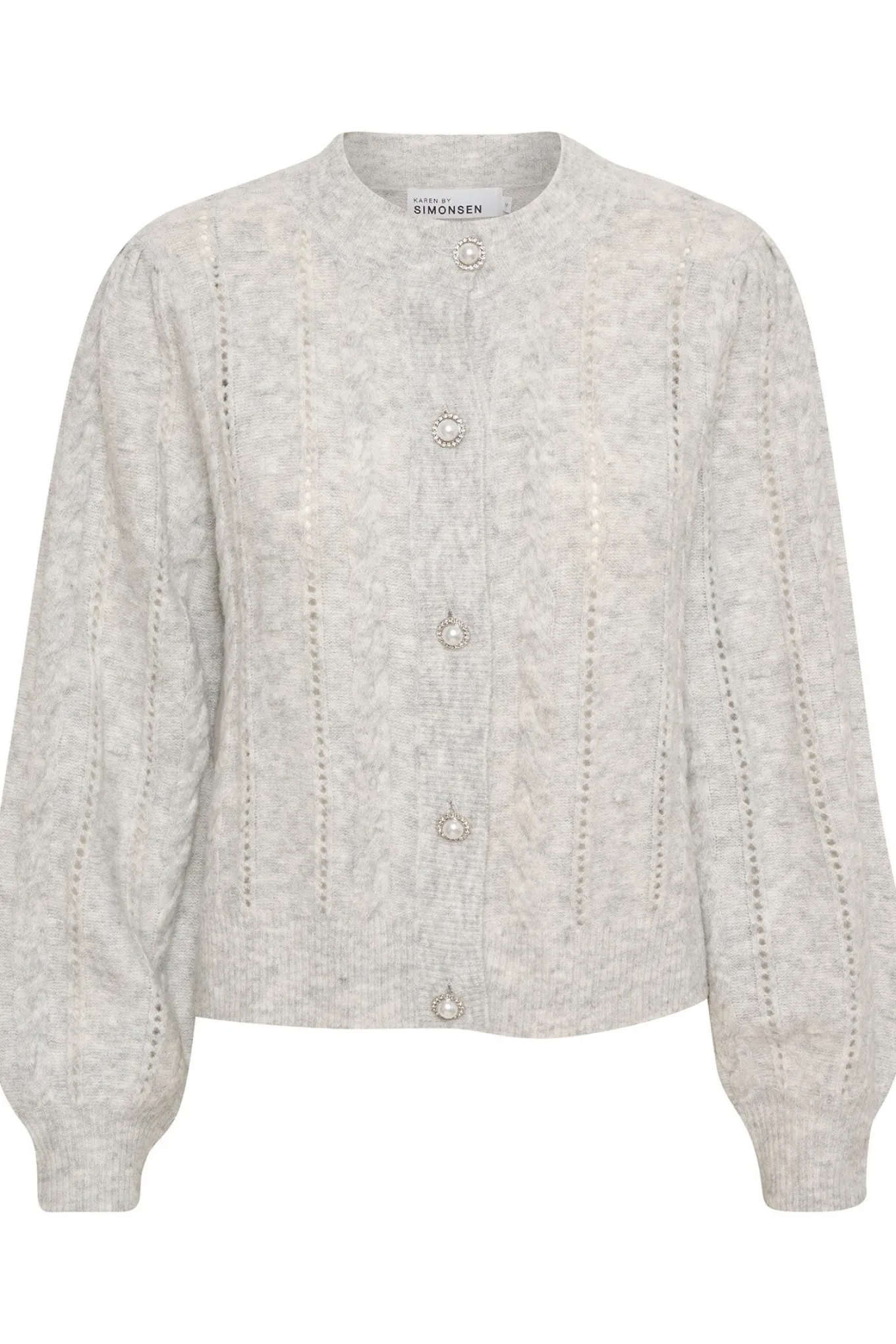 OBS! Fjernlager. Levering kan blive forlænget med 2-3 dage, hvis varen ikke findes i vores butik lige nu.Sød cardigan fra Karen By Simonsen med lange let puffede ærmer, rund hals og smukke knapper langs fronten. Cardiganen har også et fint hullet mønster og et klassisk snit.