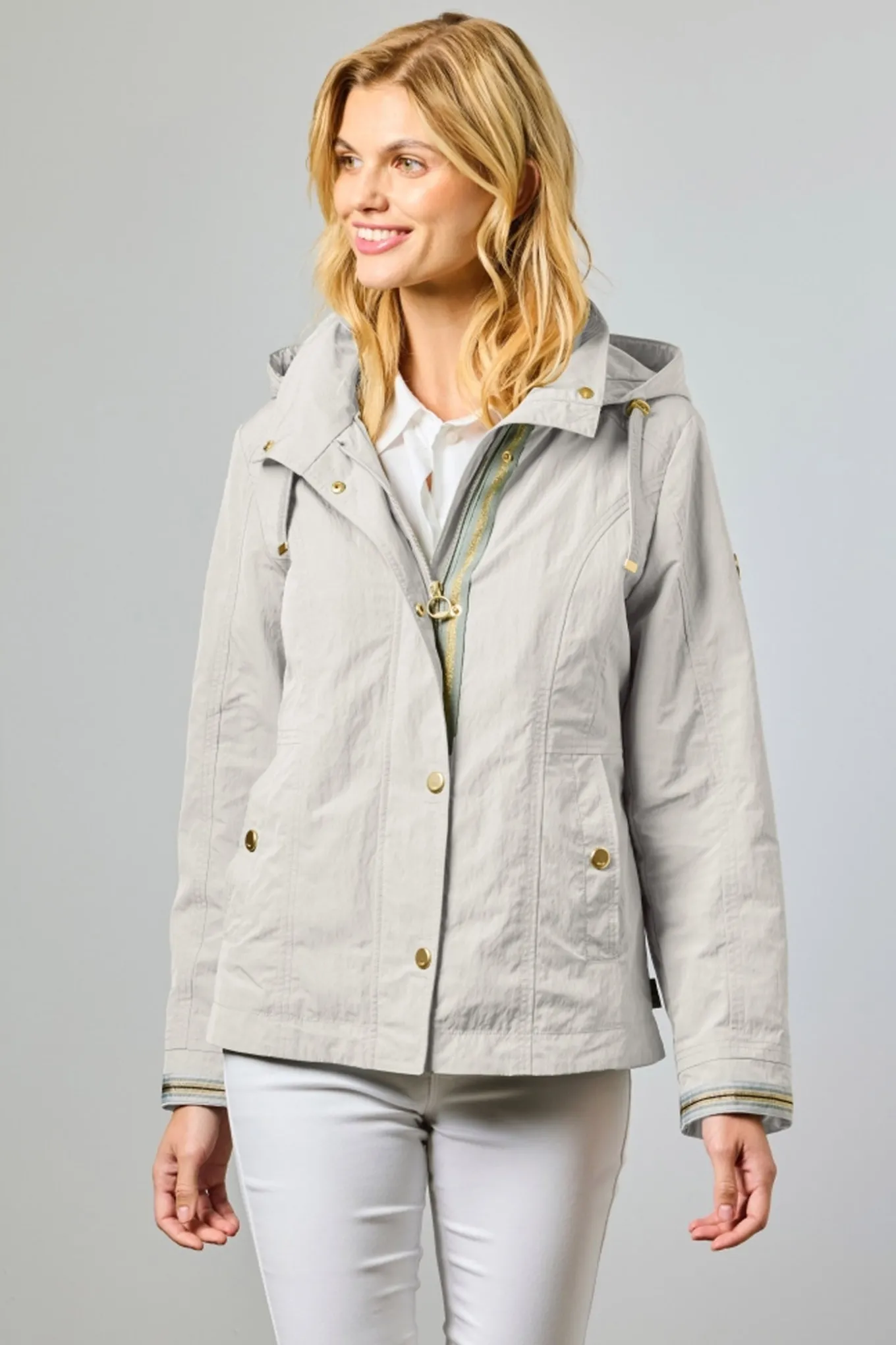 – Aftagelig hætte med printet snorStribede bånd på manchetter og lynlås i skalfarve, lysegrå og guld