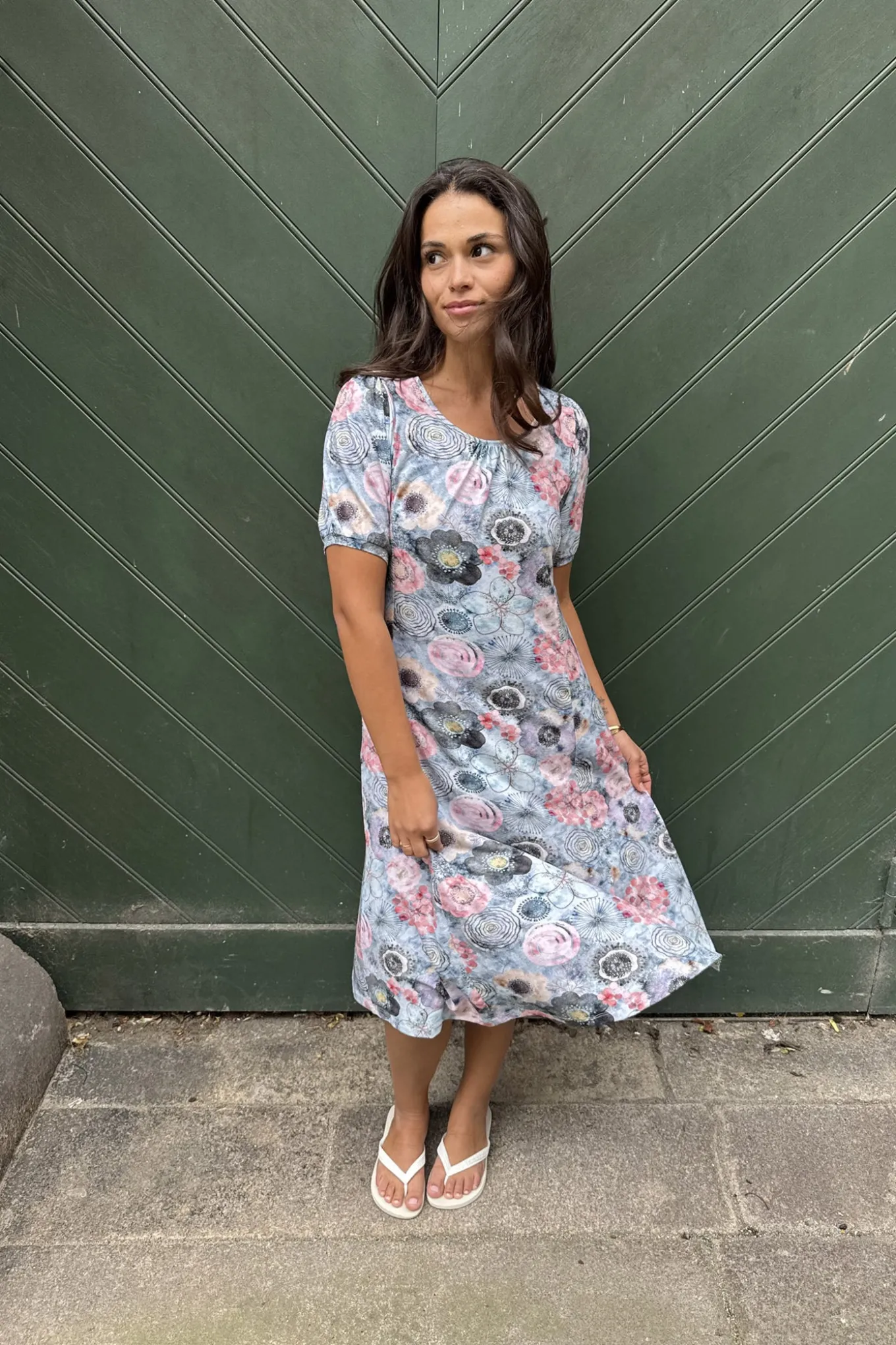 OBS! Fjernlager. Levering kan blive forlænget med 2-3 dage, hvis varen ikke findes i vores butik lige nu.Sød kjole fra 2-Biz med korte pufærmer, run halsudskæring og det flotteste farverige print.