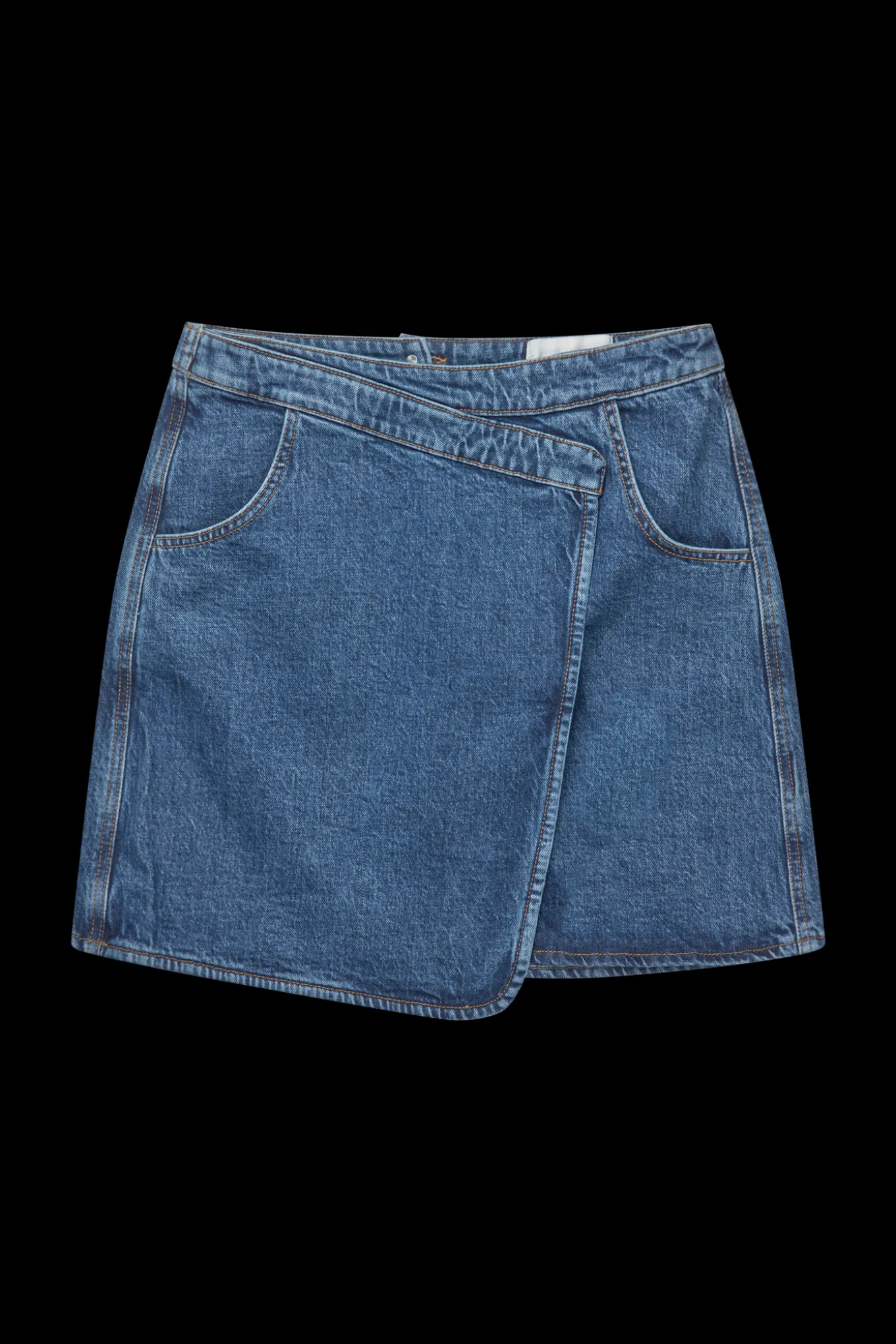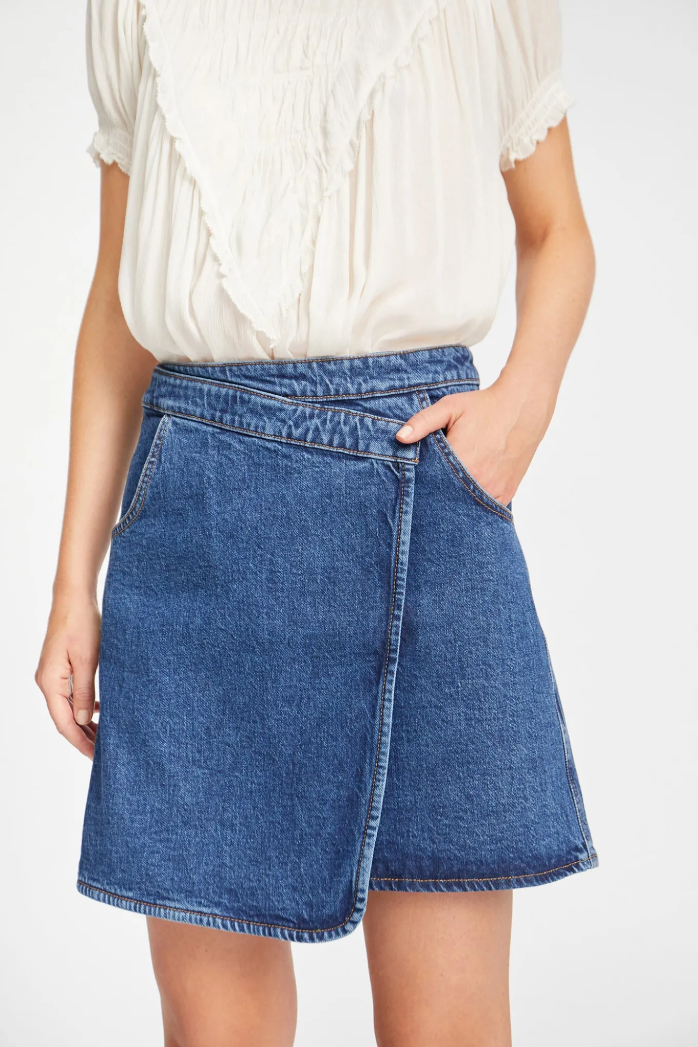 OBS! Fjernlager. Levering kan blive forlænget med 2-3 dage, hvis varen ikke findes i vores butik lige nu.Kort denim nederdel fra Munthe med en fin slå-om effekt, lommer i siderne og en klassisk blå vask.