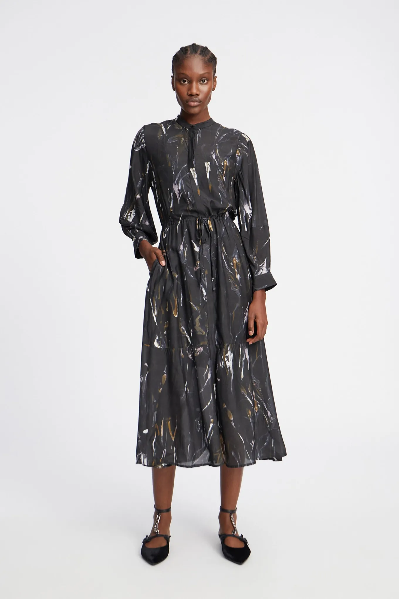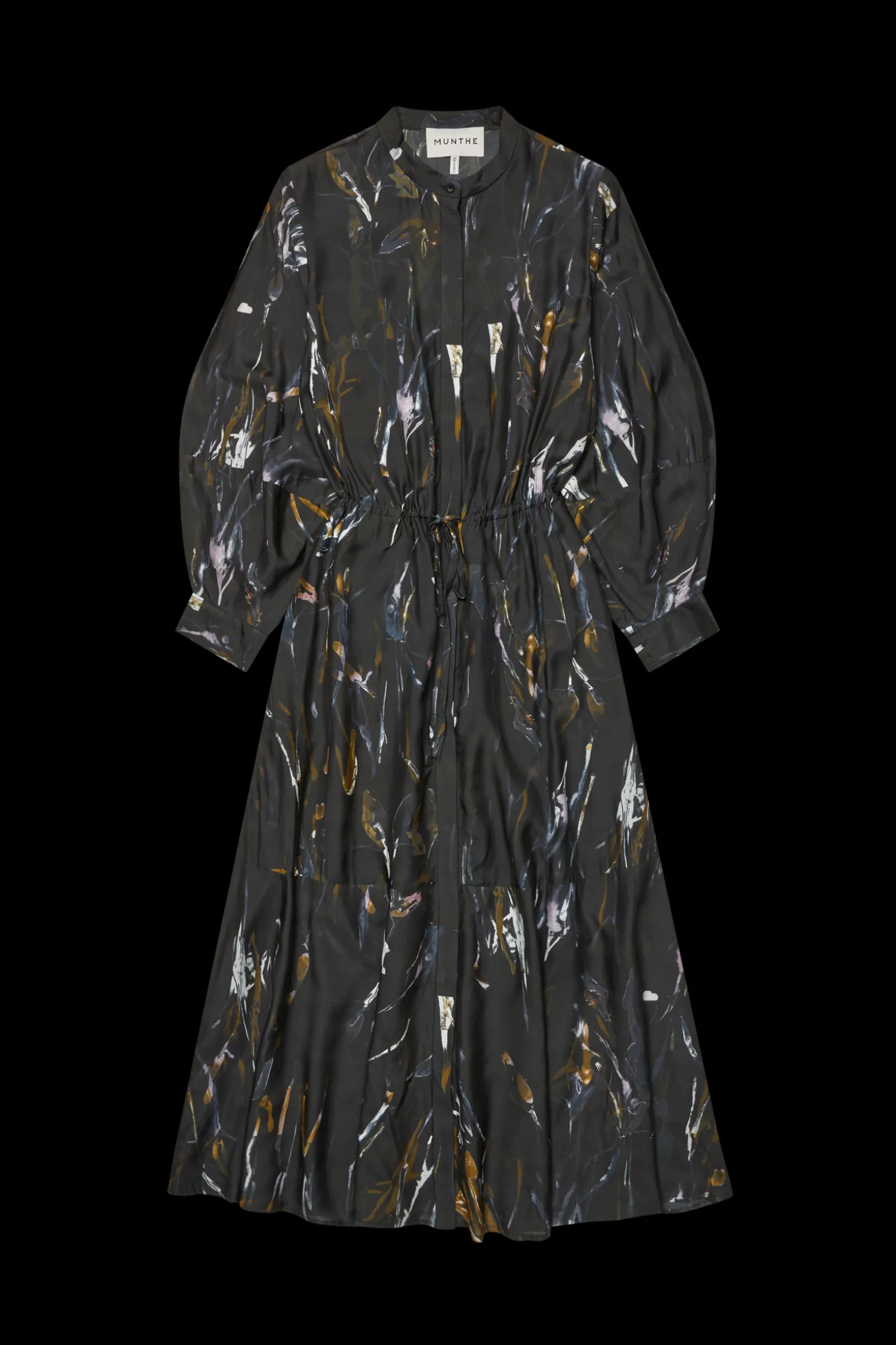 OBS! Fjernlager. Levering kan blive forlænget med 2-3 dage, hvis varen ikke findes i vores butik lige nu.Smuk kjole fra Munthe med lange ærmer, kinakrave i halsen og skjult knaplukning langs fronten.Kjolen har også et smalt bindebånd i taljen, en bred flæsekant i bunden af skørtet og et smukt abstrakt print.