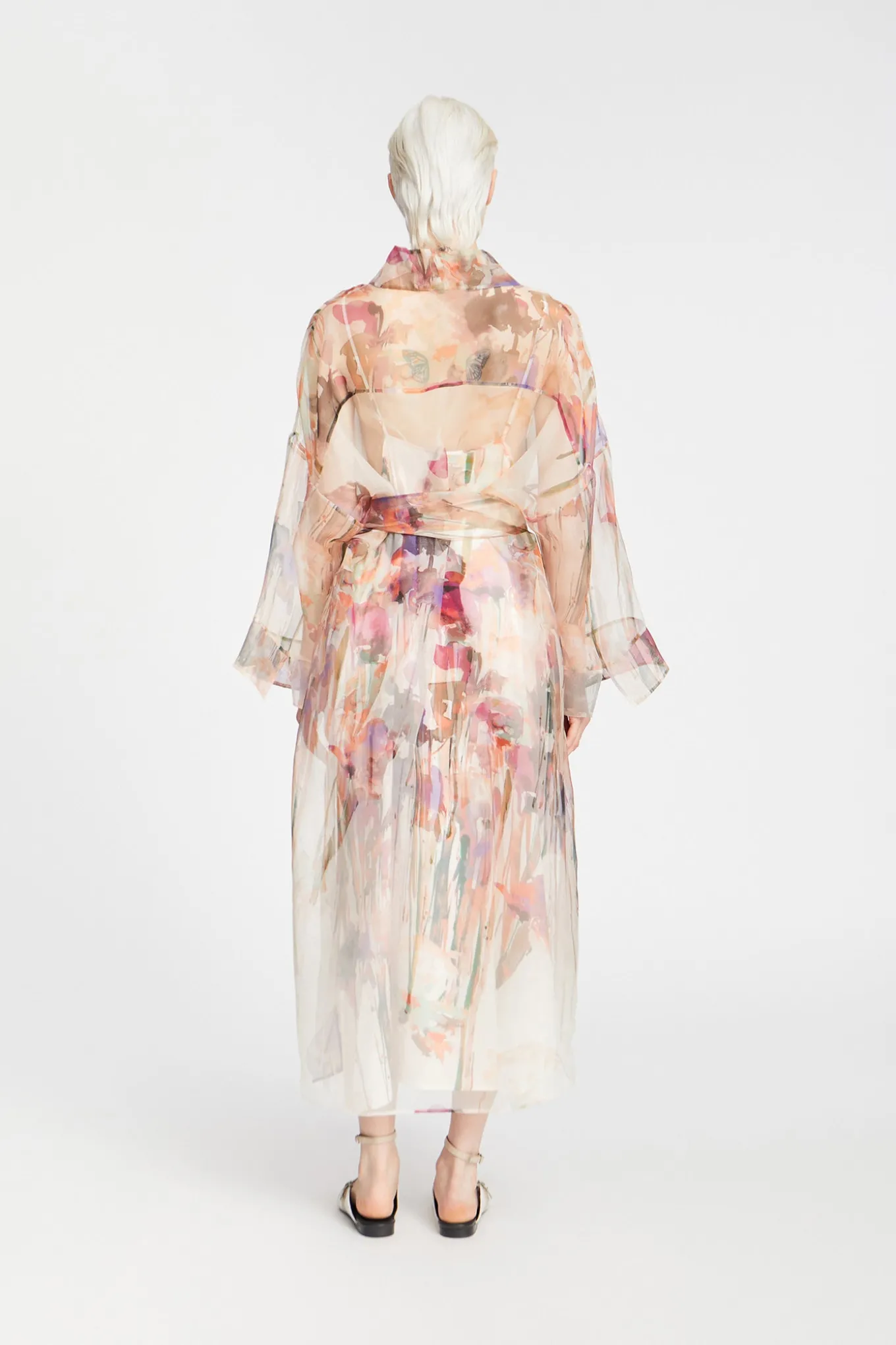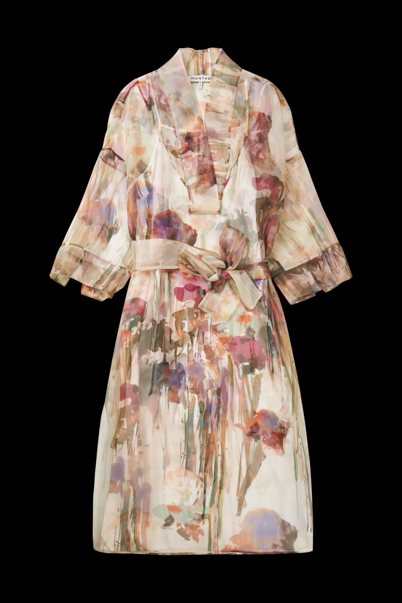 OBS! Fjernlager. Levering kan blive forlænget med 2-3 dage, hvis varen ikke findes i vores butik lige nu.Smuk kjole fra Munthe i en flot silkekvalitet.Kjolen består af en elegant underkjole med smalle skulderstropper, det smukkeste transparente yderlag med et malerisk print og et fint bindebælte til taljen.