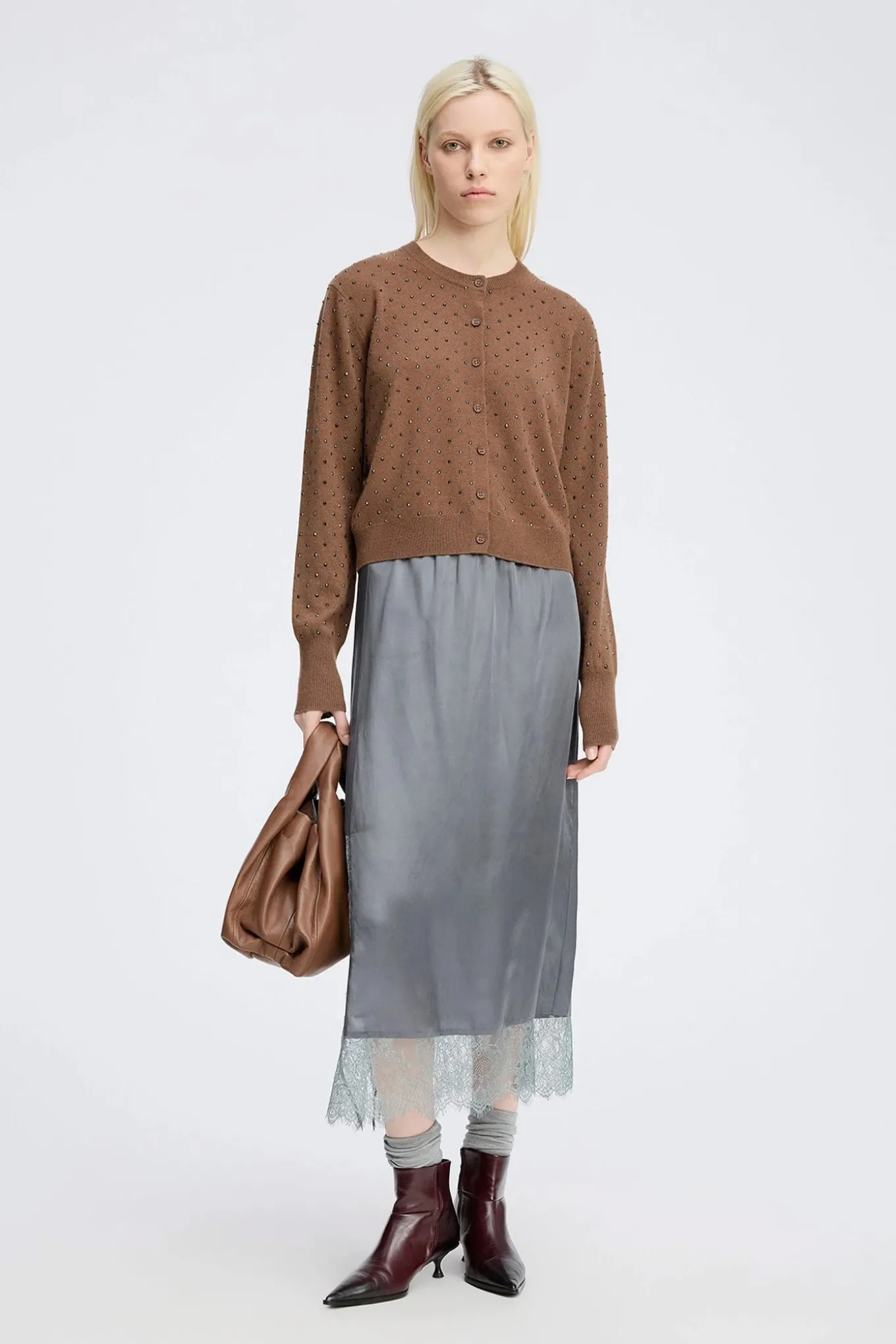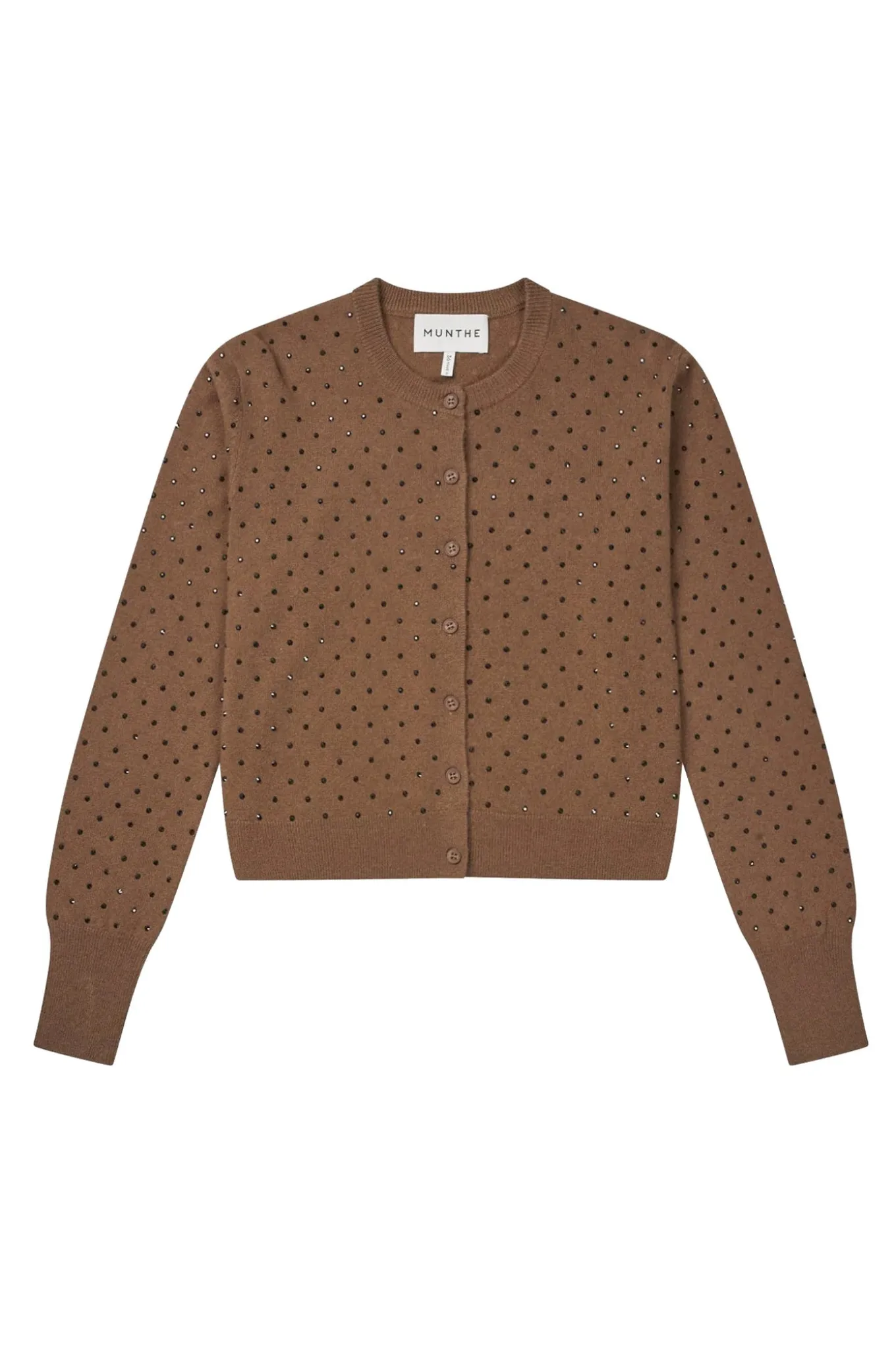 Smuk blød cardigan med elegante sølvfarvede nitter. Cardiganen har en klassisk rund hals, lange ærmer og knaplukning foran.