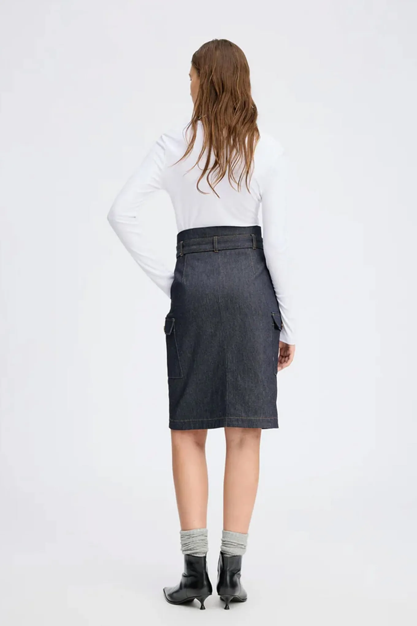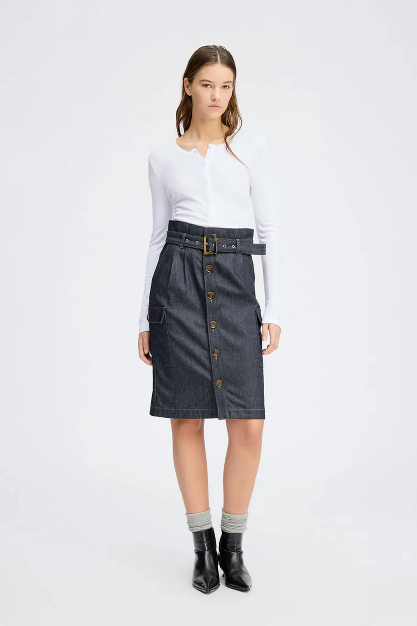 Elegant højtaljet denimnederdel med knaplukning foran, aftageligt bælte og statement flaplommer i siden.